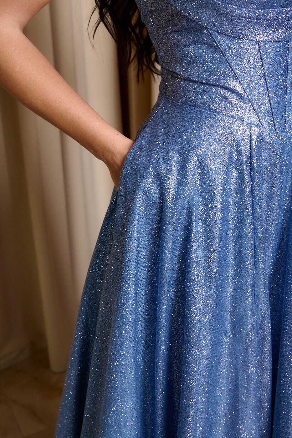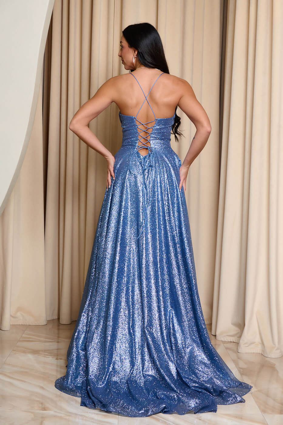 Φόρεμα maxi με κορσέ και τρισδιάστατο γκλίτερ baby blue. Στο πάνω μέρος έχει κορσέ με δέσιμο πίσω και εσωτερικά cups. Το κάτω μέρος είναι σε ίσια γραμμή με κομψό σκίσιμο στο πλάι. Κλείνει με φερμουάρ πίσω και διαθέτει εσωτερική φόδρα.