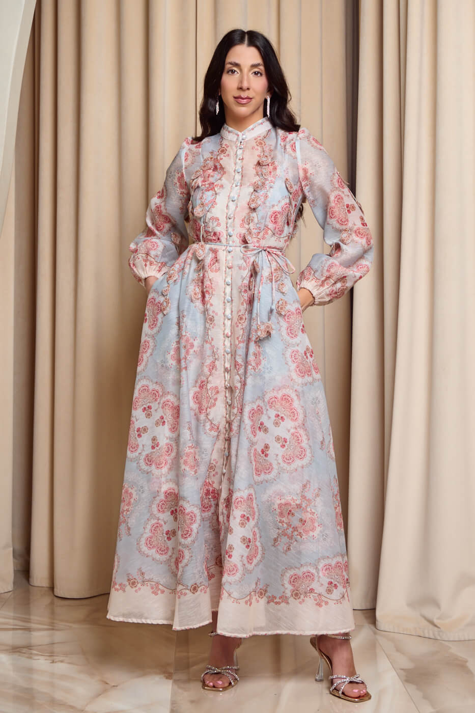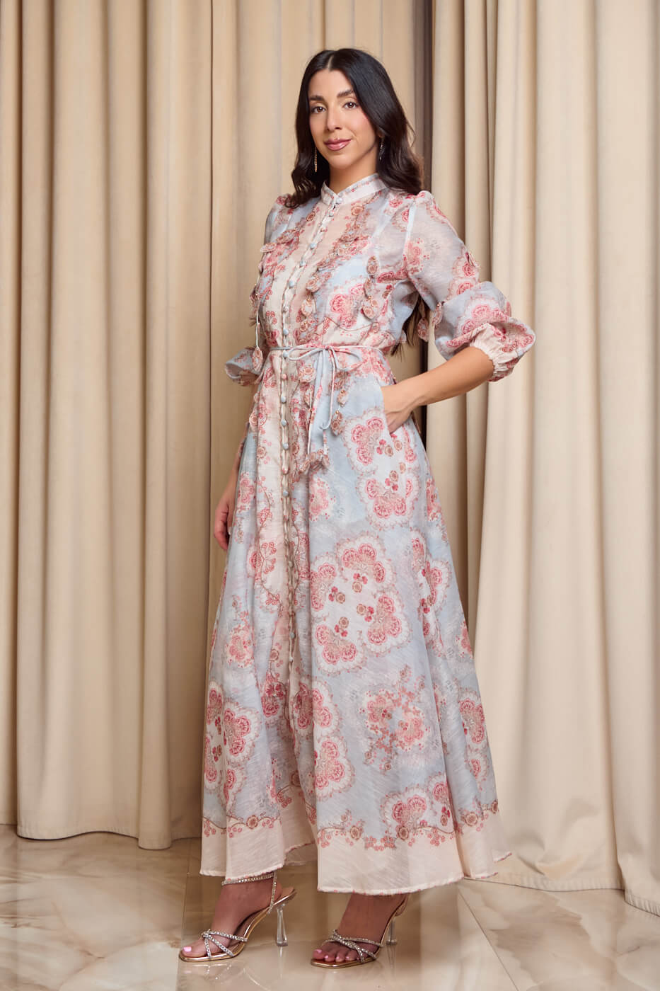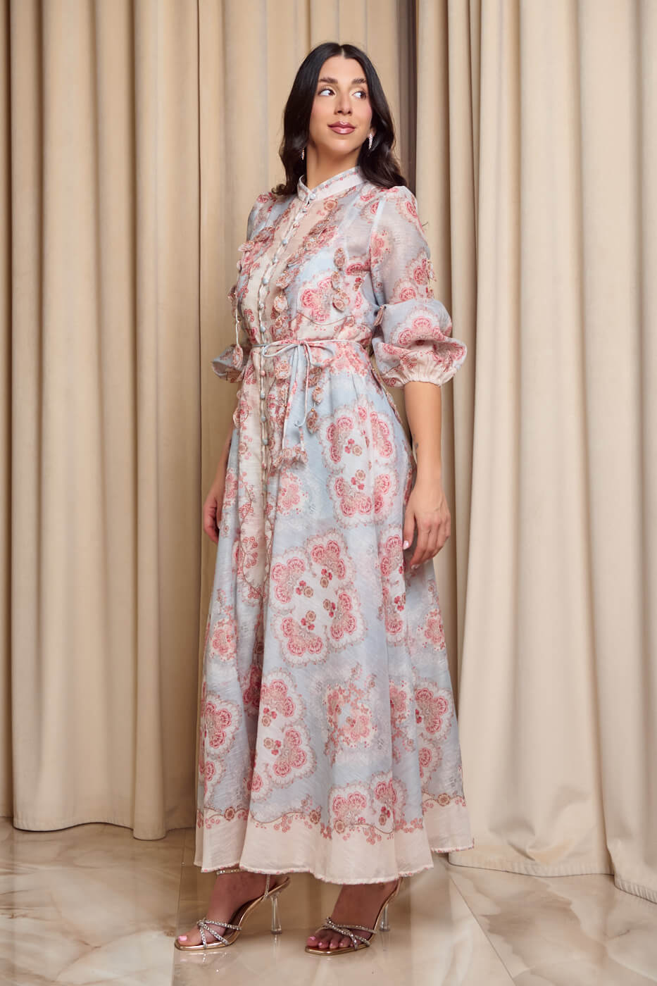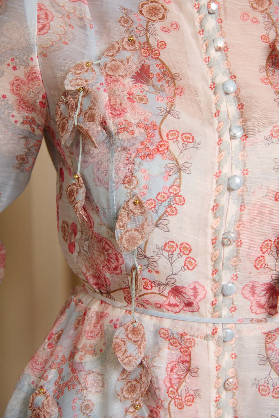 Ένα ρομαντικό φόρεμα με ιδιαίτερο λαχούρ floral μοτίβο πάνω  σε μέντα βάση. Διαθέτει mao γιακά και υφασμάτινα κουμπιά στην ίδια απόχρωση. Σε όλο του το μήκος έχει τρισδιάστατα φύλλα με χρυσές λεπτομέρειες. Τα μανίκια είναι μακριά ημιδιάφανα με λάστιχο στο τελείωμα. Διαθέτει αποσπώμενο μεσοφόρι με το ίδιο μοτίβο, τσέπες και δική του αποσπώμενη ζώνη. Κλείνει με φερμουάρ πίσω ενώ ανοίγουν και τα μπροστινά κουμπιά.