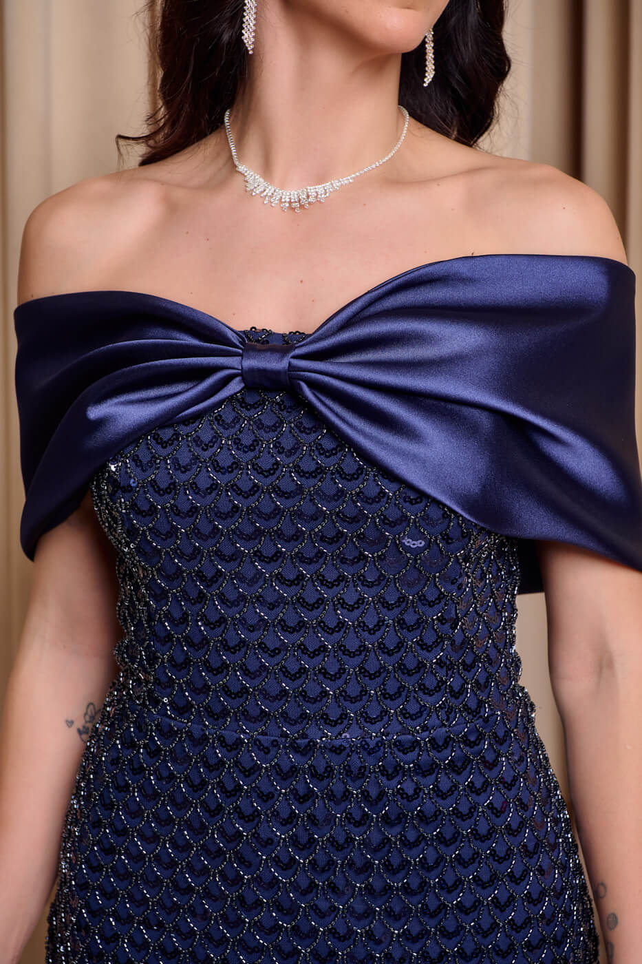 Φόρεμα maxi με παγιέτες και αποσπώμενο σατέν φιόγκο midnight blue . Εντυπωσιακό maxi φόρεμα στην πιο κομψή midnight blue απόχρωση. Διαθέτει λαμπερές παγιέτες και χάντρες σε όλο του το μήκος. Το φόρεμα είναι στράπλες αλλά στο πάνω μέρος έχει αποσπώμενη σατέν off shoulder λεπτομέρεια φιόγκου που κλείνει με κουμπιά πίσω. Το κάτω μέρος είναι σε ίσια γραμμή με κομψό σκίσιμο πίσω. Έχει εσωτερικά cups και φόδρα. Κλείνει με φερμουάρ πίσω. Ιδανικό για λαμπερές επίσημες εμφανίσεις που ξεχωρίζουν για το στυλ και την κομψότητα τους.