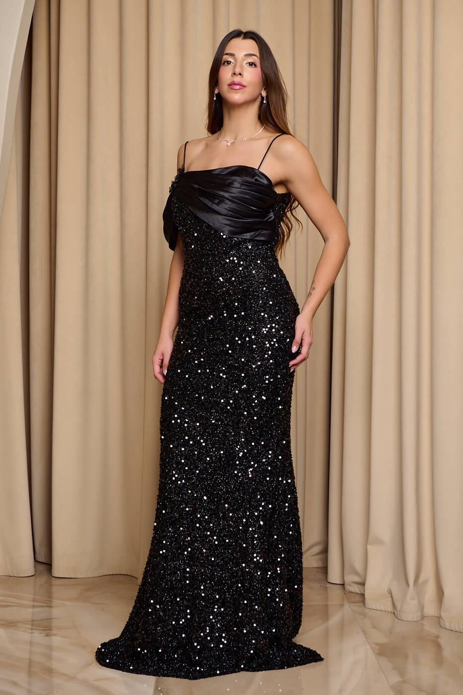 Φόρεμα maxi με παγιέτες και ντραπέ σατεν σχέδιο μαύρο