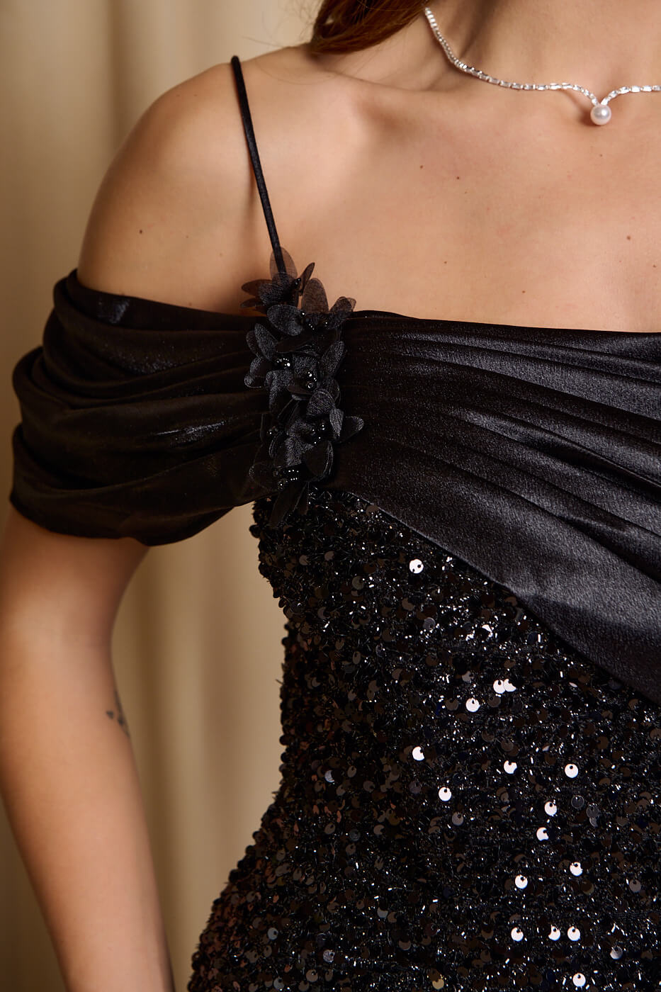 Φόρεμα maxi με παγιέτες και ντραπέ σατεν σχέδιο μαύρο . Λαμπερό μαύρο φόρεμα με παγιέτες. Στο πάνω μέρος έχει σατεν ντραπέ σχέδιο με έναν ώμο και διακοσμητικά λουλούδια. Διαθέτει εσωτερική φόδρα, λεπτές τιράντες και κλείνει με φερμουάρ πίσω.