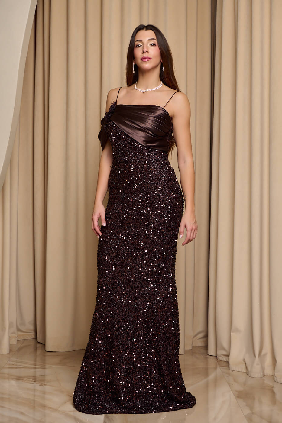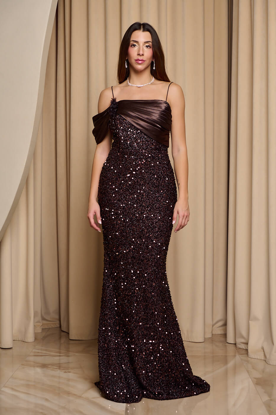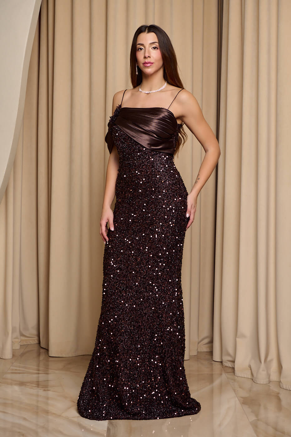 Φόρεμα maxi με παγιέτες και ντραπέ σατεν σχέδιο καφέ . Λαμπερό φόρεμα με παγιέτες σε καφέ απόχρωση. Στο πάνω μέρος έχει σατεν ντραπέ σχέδιο με έναν ώμο και διακοσμητικά λουλούδια. Διαθέτει εσωτερική φόδρα, λεπτές τιράντες και κλείνει με φερμουάρ πίσω. Ιδανικό για λαμπερές εμφανίσεις που ξεχωρίζουν.
