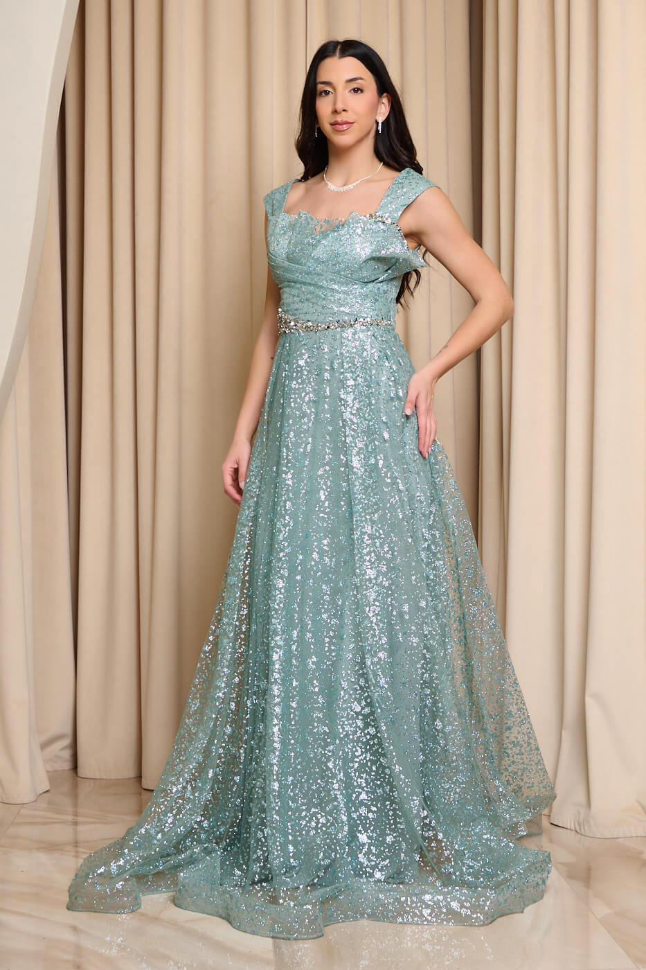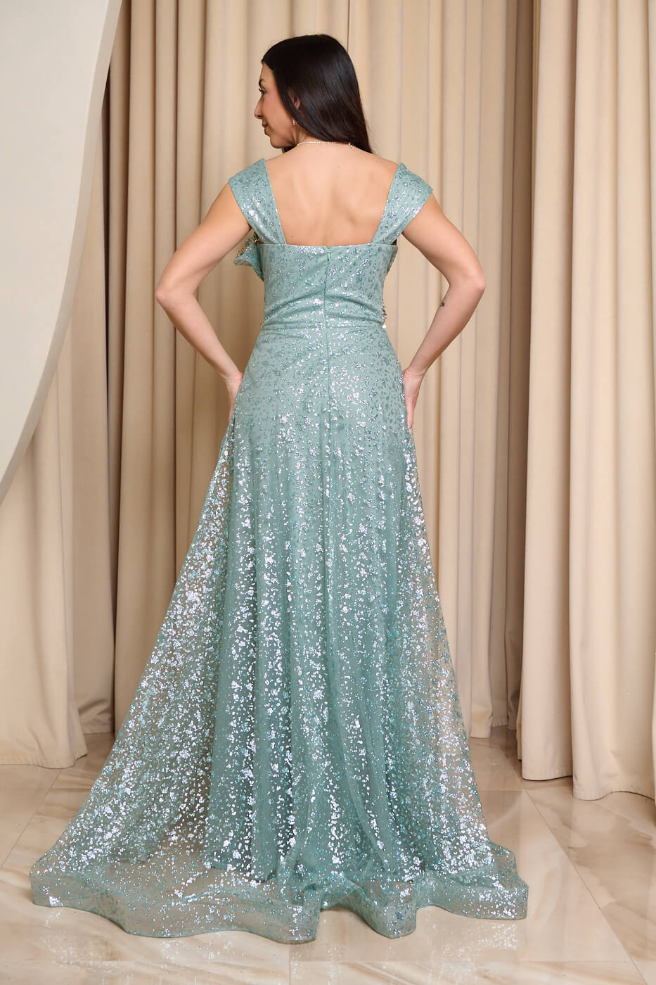 Φόρεμα maxi με πιέτες και τρισδιάστατο γκλίτερ μέντα