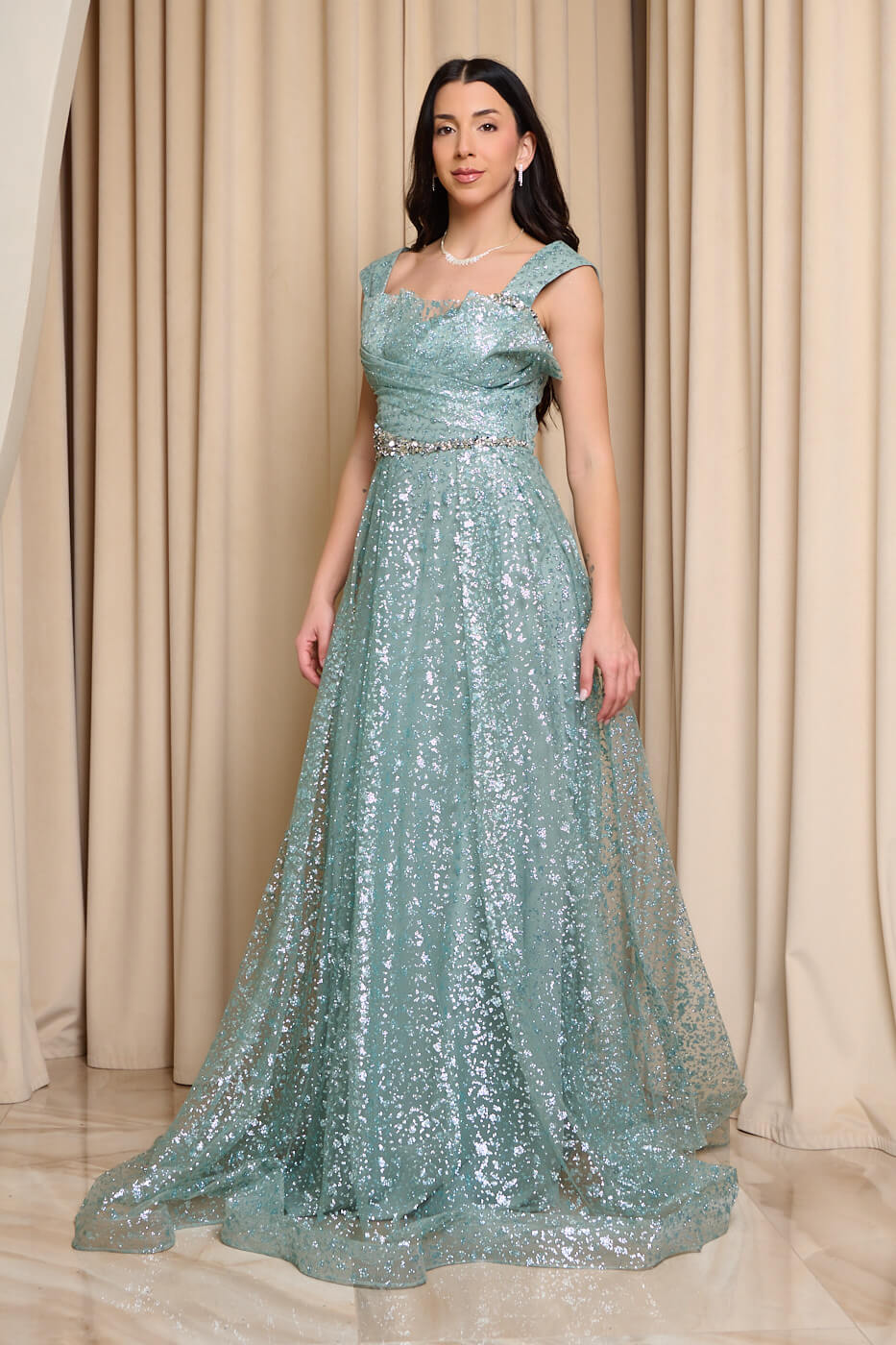 Φόρεμα maxi με πιέτες και τρισδιάστατο γκλίτερ μέντα. Εντυπωσιακό maxi  φόρεμα σε απόχρωση μέντα. Διαθέτει τρισδιάστατο γκλίτερ σε όλο του το μήκος. Στο πάνω μέρος έχει φαρδιές τιράντες, εσωτερικά cups και σχέδιο τύπου βολάν με πιέτες και λαμπερή λεπτομέρεια. Στη μέση έχει επίσης διακόσμηση από χάντρες και στρας. Το κάτω μέρος είναι σε άλφα γραμμή με πολύ ωραία κίνηση. Έχει εσωτερική φόδρα και κλείνει με φερμουάρ πίσω.  Ιδανικό για λαμπερές επίσημες εμφανίσεις που ξεχωρίζουν για την κομψότητα και τη ρομαντική αισθητική τους.
