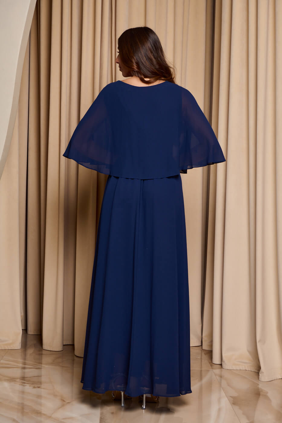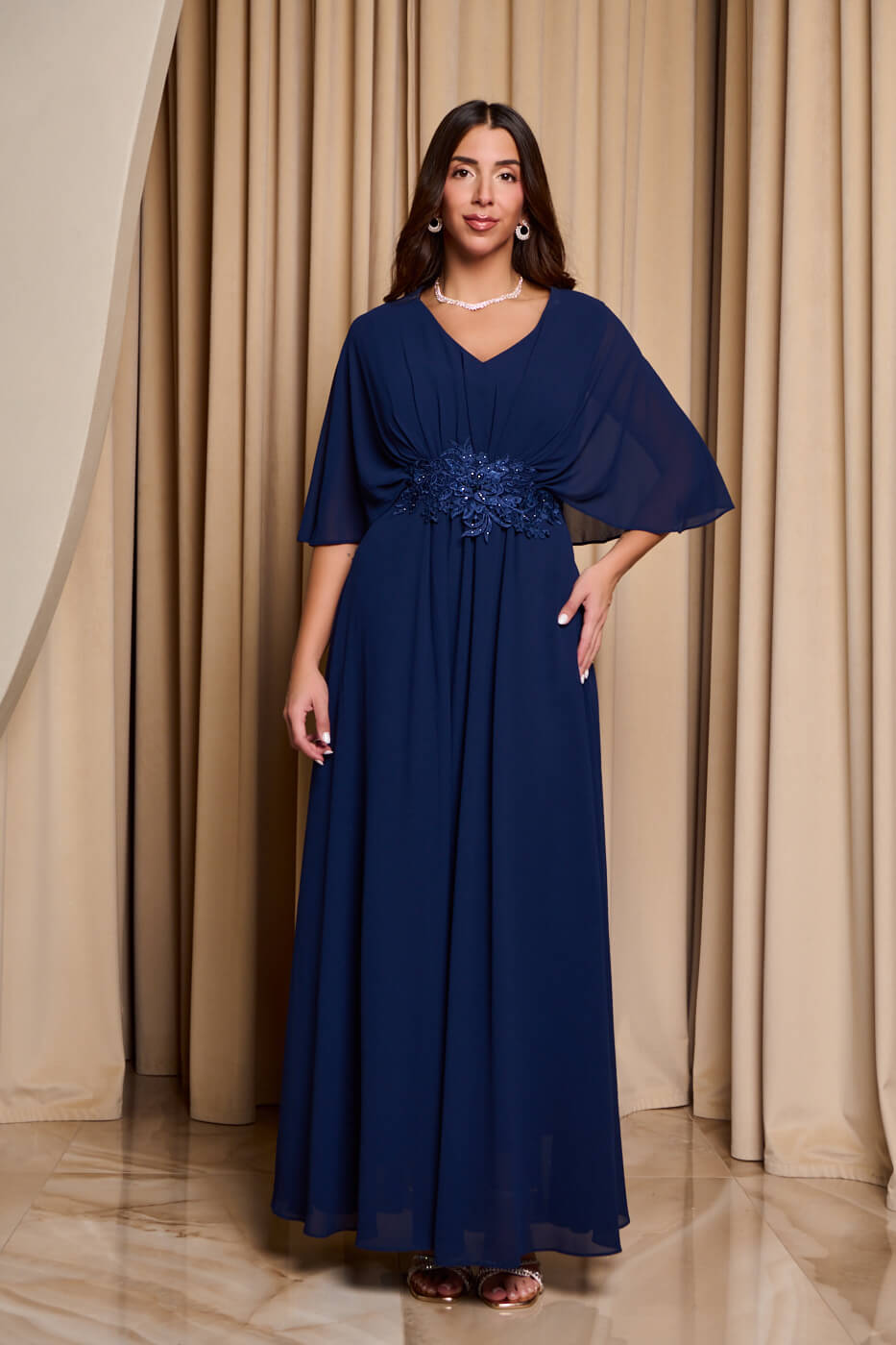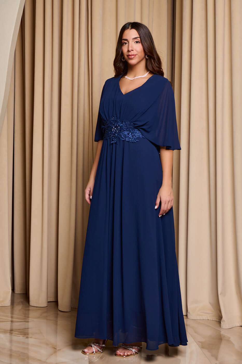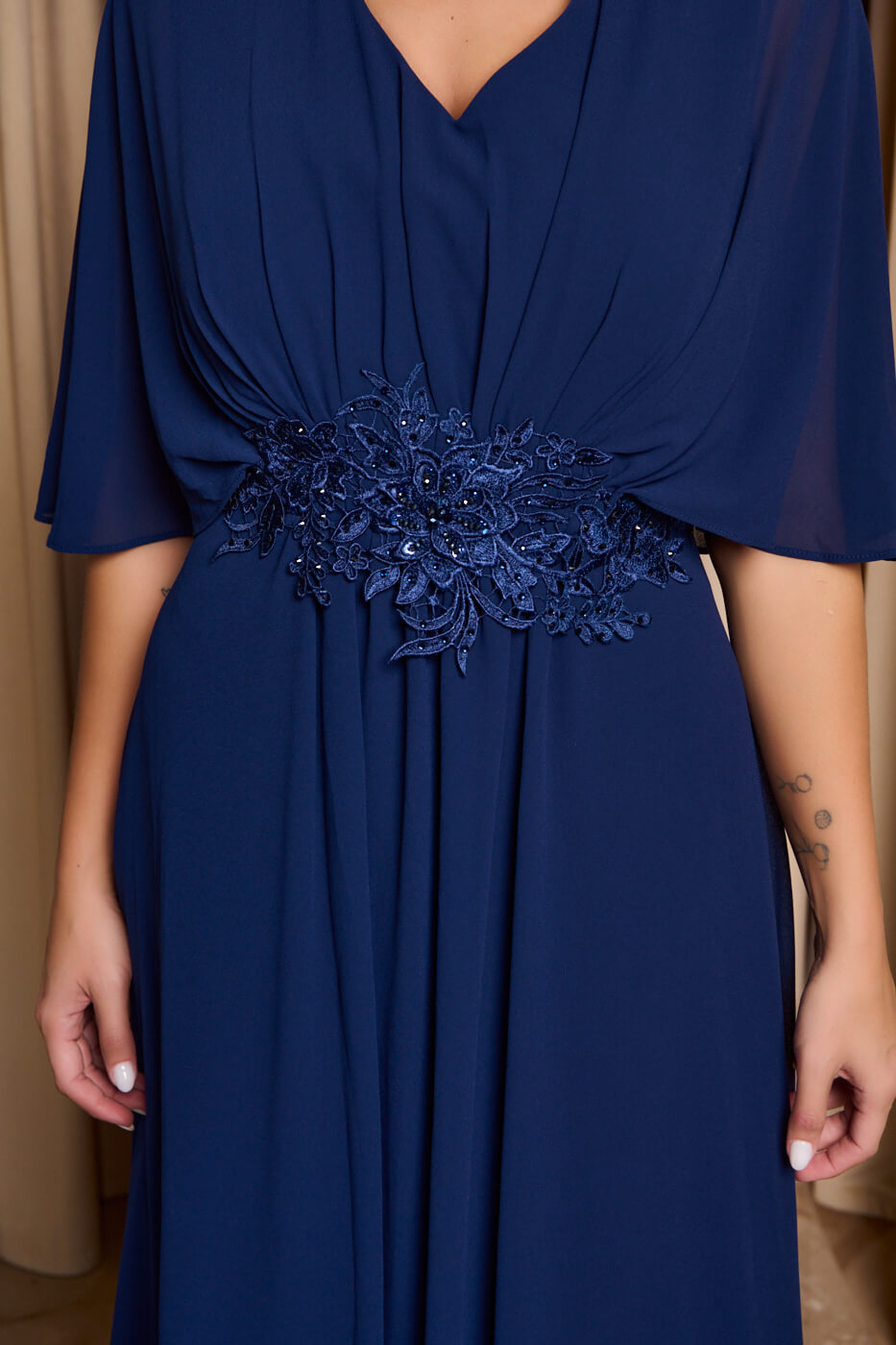 Φόρεμα maxi με πλισέ V ντεκολτέ και λεπτομέρεια με στρας midnight blue. Αέρινο και κομψό με βαθύ V ντεκολτέ και πλισέ στο μπούστο. Κάτω από το στήθος μια περίτεχνη λεπτομέρεια με κεντημένα λουλούδια με στρας αγκαλιάζει αρμονικά την σιλουέτα. Χοντρές τιράντες που καλύπτονται από βολάν ημιδιάφανο ύφασμα προσθέτοντας μία ρομαντική πινελιά. Η πλάτη διαθέτει ελαστική σφηκοφωλιά, ενώ η εσωτερική φόδρα προσφέρει κάλυψη.