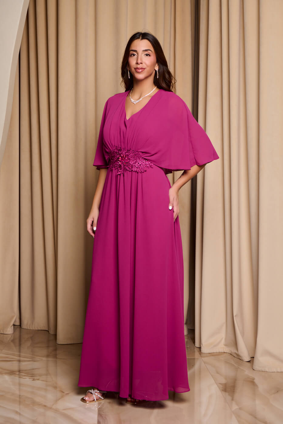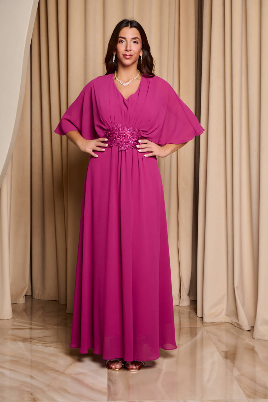 Φόρεμα maxi με πλισέ V ντεκολτέ και λεπτομέρεια με στρας ροζ