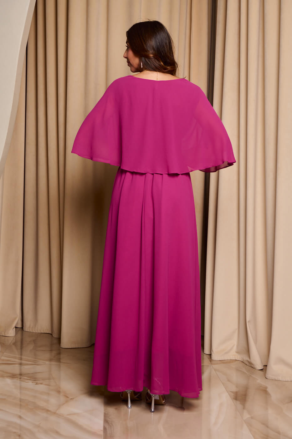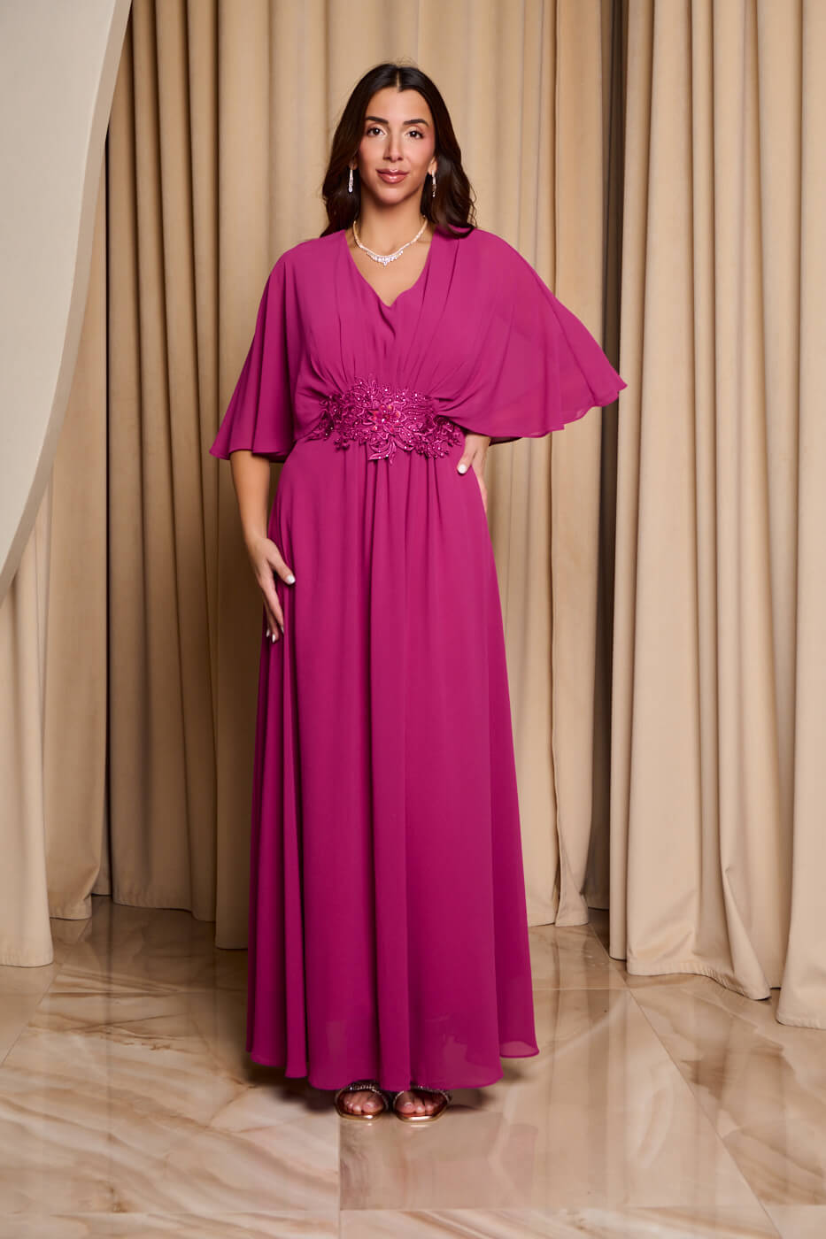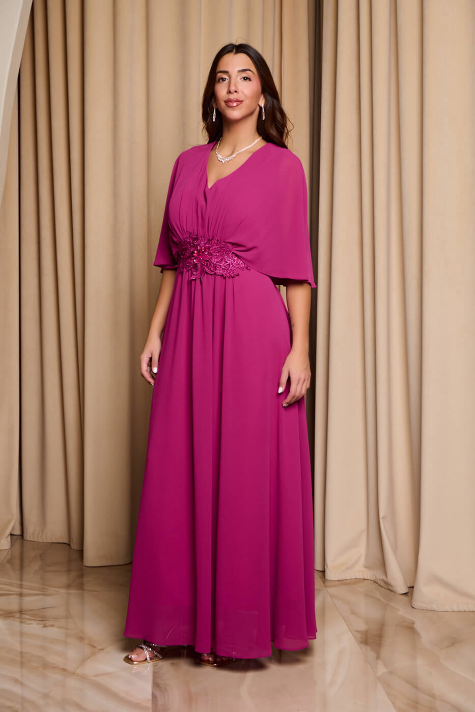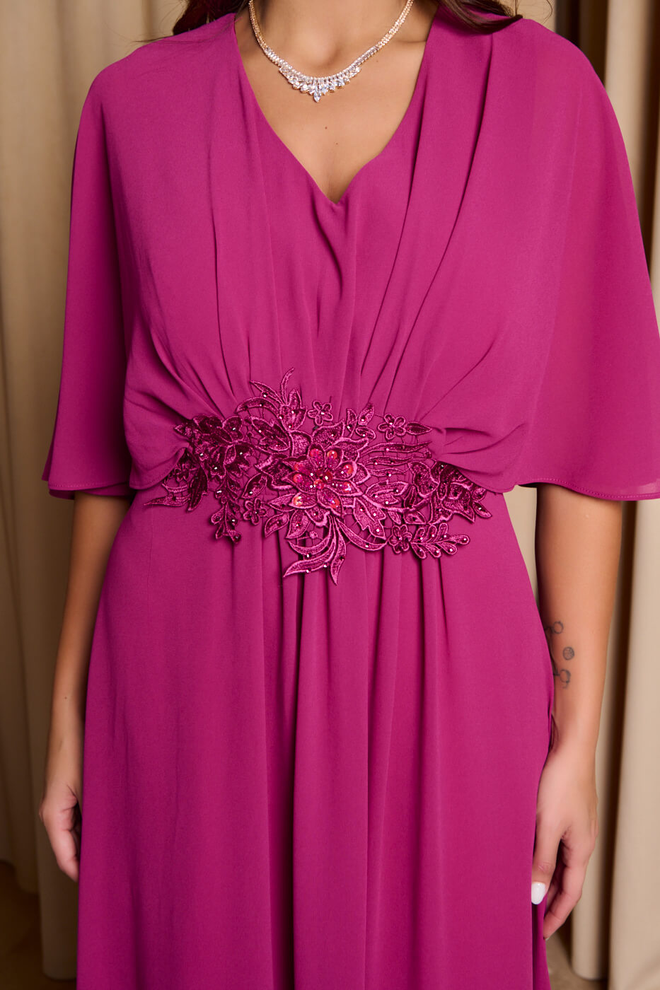 Φόρεμα maxi με πλισέ V ντεκολτέ και λεπτομέρεια με στρας μωβ. Αέρινο και κομψό με βαθύ V ντεκολτέ και πλισέ στο μπούστο. Κάτω από το στήθος μια περίτεχνη λεπτομέρεια με κεντημένα λουλούδια με στρας αγκαλιάζει αρμονικά την σιλουέτα. Χοντρές τιράντες που καλύπτονται από βολάν ημιδιάφανο ύφασμα προσθέτοντας μία ρομαντική πινελιά. Η πλάτη διαθέτει ελαστική σφηκοφωλιά, ενώ η εσωτερική φόδρα προσφέρει κάλυψη.