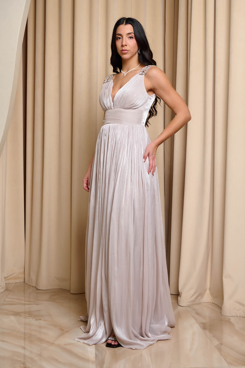 Φόρεμα maxi με πτυχώσεις και διακοσμημένους ώμους ιβουάρ. Ένα αέρινο και εντυπωσιακό ιβουάρ φόρεμα. Έχει βαθύ ντεκολτέ με διαφάνεια που αναδεικνύει το μπούστο και σούρα στη μέση που κολακεύει τη σιλουέτα. Οι ώμοι είναι διακοσμημένοι με πέτρες και στρας που σε συνδυασμό με το ελαφρώς γυαλιστερό του ύφασμα δίνουν στο φόρεμα μια διακριτική λάμψη. Διαθέτει cups και εσωτερική φόδρα. Κλείνει με φερμουάρ στην πλάτη. Το κάτω μέρος του φορέματος είναι αέρινο με διακριτικό άνοιγμα στο πλάι που προσδίδει ανάλαφρη κίνηση κατά το περπάτημα. Ένα φόρεμα που συνδυάζει ρομαντισμό και λάμψη, ιδανικό για να ξεχωρίσεις με στυλ.