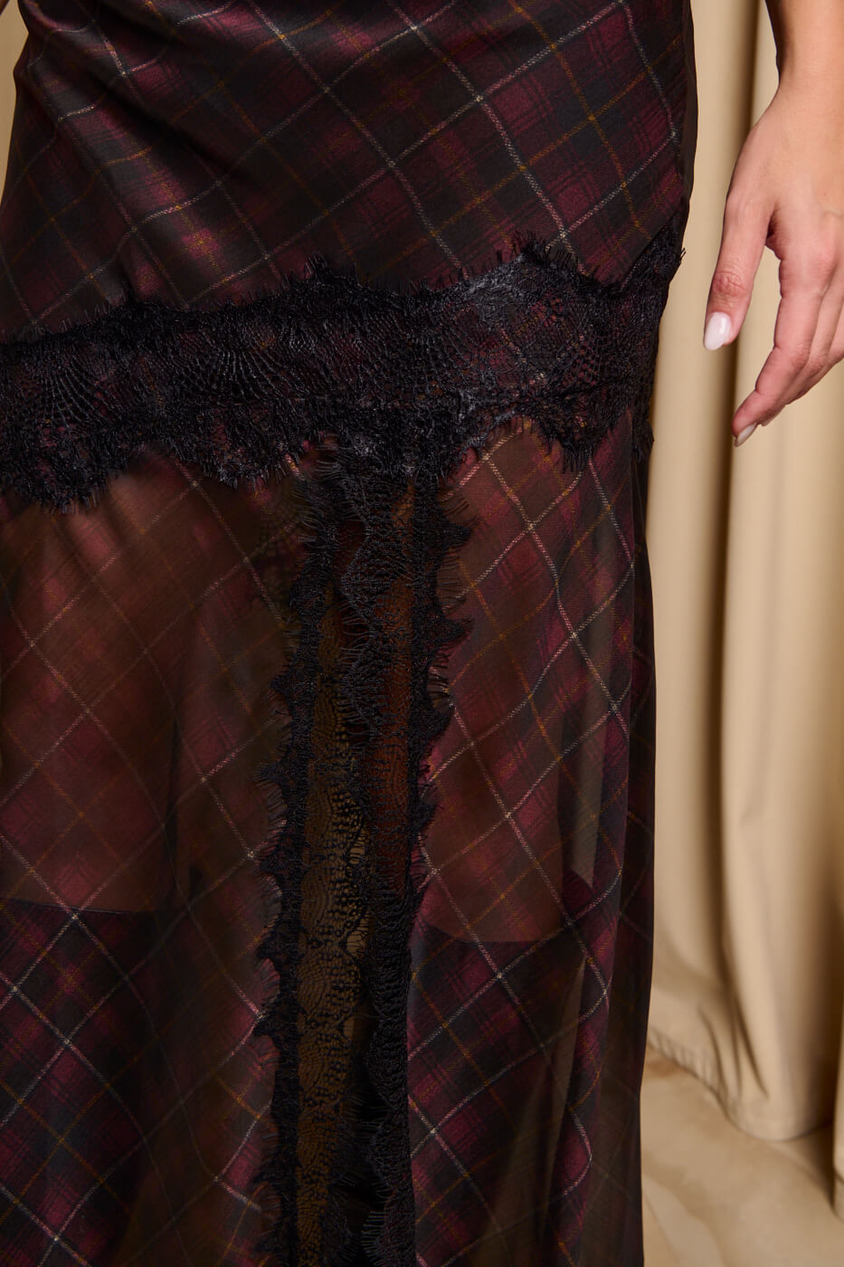 Φόρεμα maxi με σχέδια δαντέλα και λεπτές τιράντες καρό. Διαθέτει εσωτερική φόδρα, λεπτές τιράντες κορδονάκι που αφήνουν την πλάτη λίγο ανοιχτή πίσω και έχει σκίσιμο στο πλάι. Με σχέδιο δαντέλες στην μέση και στο τελείωμα.