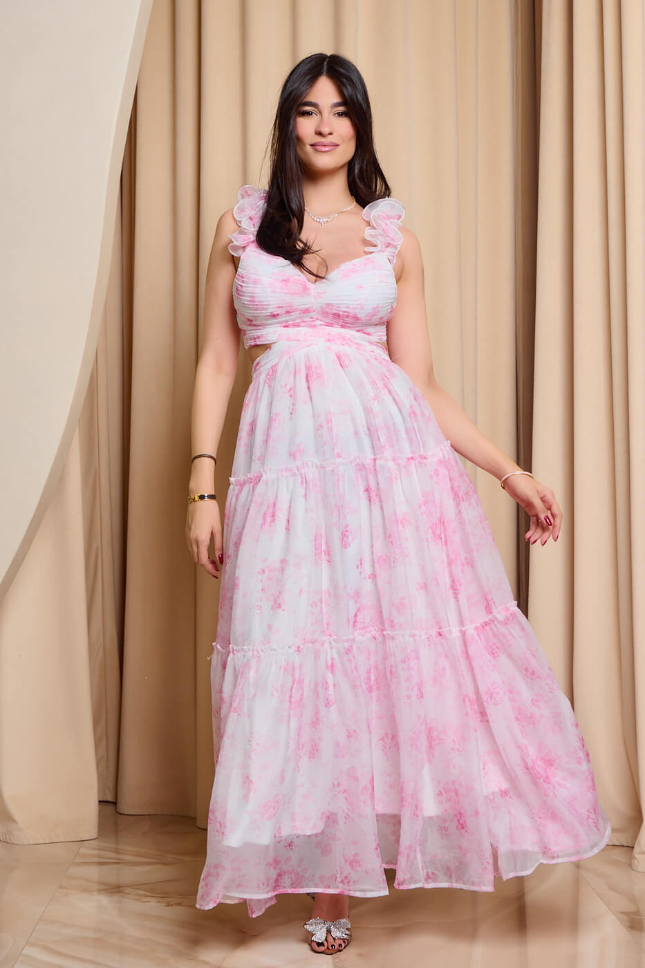 Φόρεμα maxi με τούλι και cut out baby pink . Ένα αέρινο και παραμυθένιο φόρεμα με λευκή βάση και baby pink floral μοτίβο. Διαθέτει πλισέ κομψό μπούστο που καταλήγει σε χιαστί και αφήνει διακριτικά ακάλυπτο το πλάι. Οι τιράντες έχουν τούλινα βολάν και έχουν τη δυνατότητα ρύθμισης ύψους. Έχει εσωτερική φόδρα και κλείνει με φερμουάρ πίσω. Ιδανική επιλογή για εντυπωσιακές εμφανίσεις με ρομαντική διάθεση.