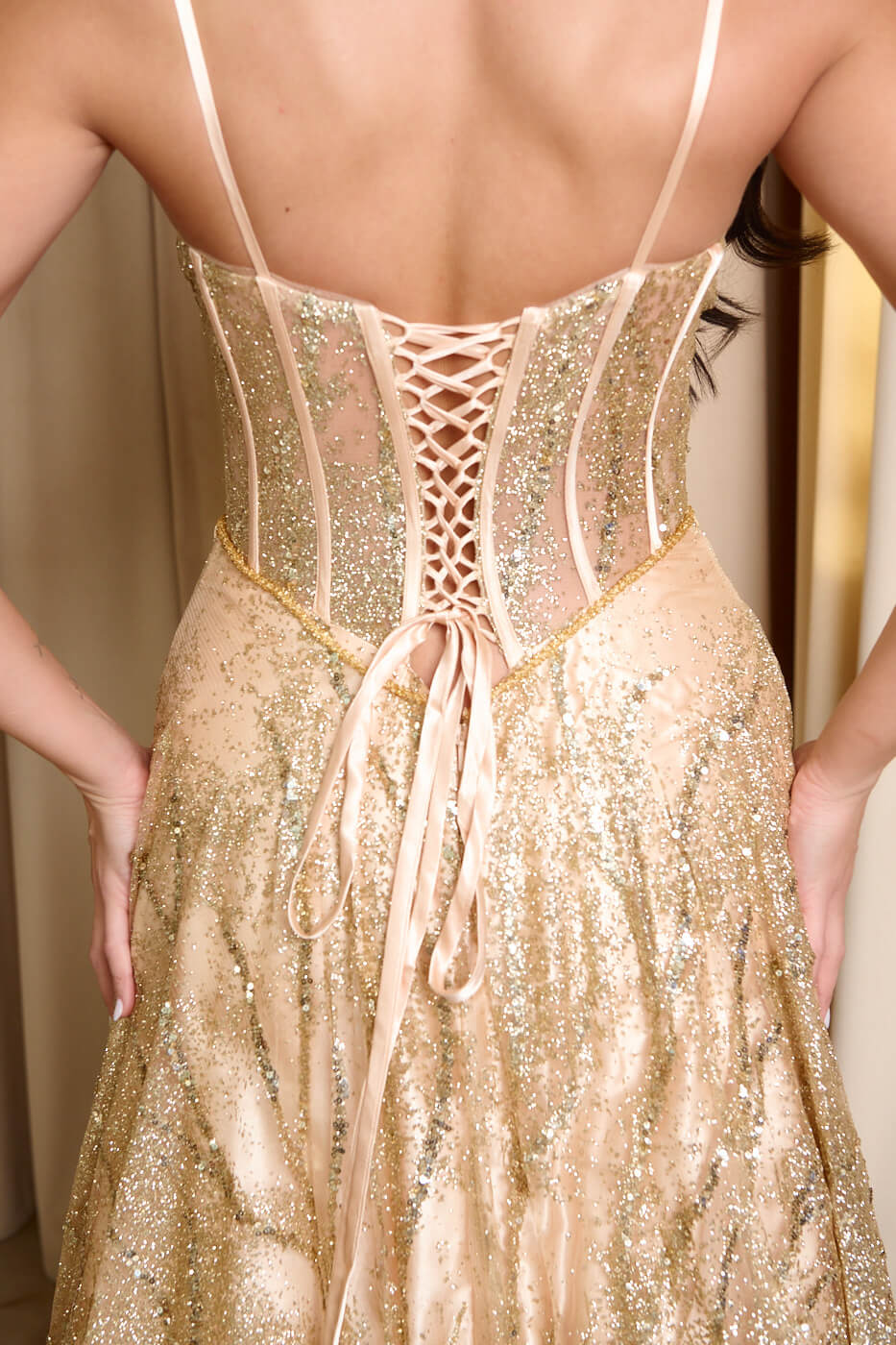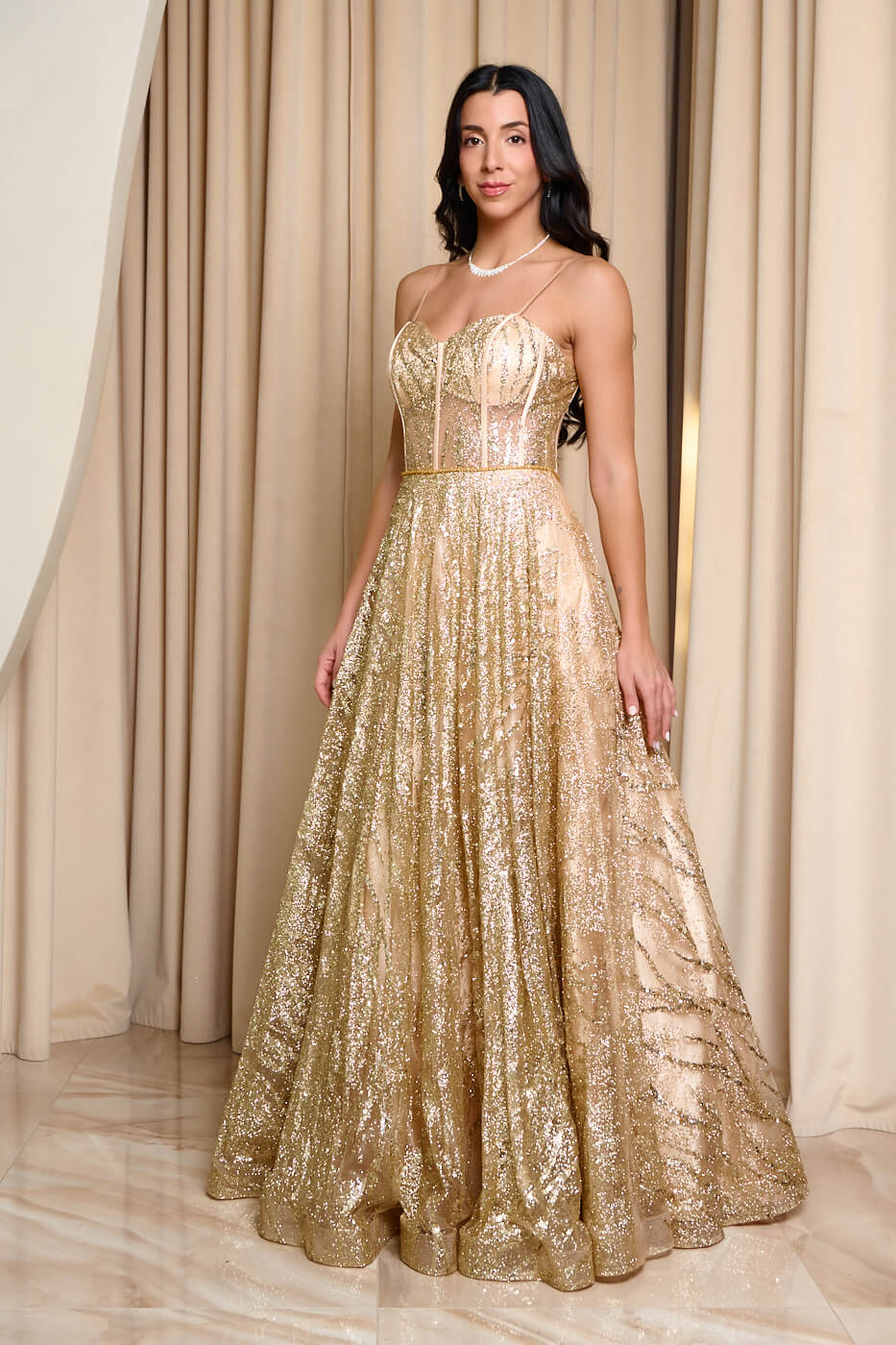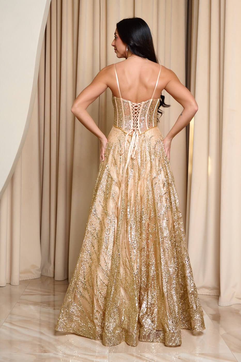 Φόρεμα maxi με τρισδιάστατο γκλίτερ και κορσέ χρυσό. Στο πάνω μέρος έχει κορσέ με δέσιμο πίσω, λεπτές τιράντες και εσωτερικά cups. Το κάτω μέρος διαθέτει διπλή εσωτερική φόδρα και τούλινο φουρό. Κλείνει με φερμουάρ πίσω.