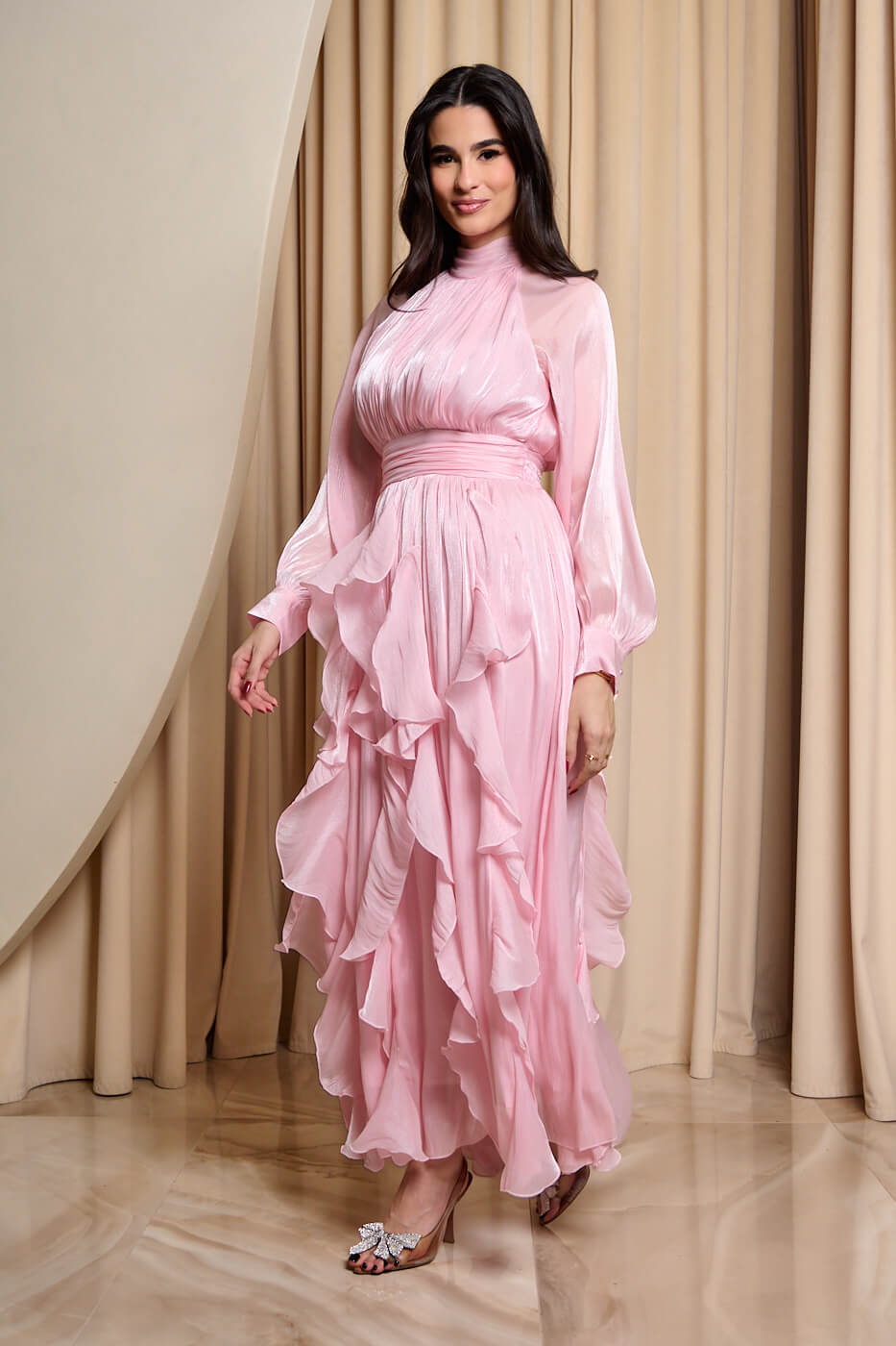 Φόρεμα maxi με βολάν baby pink . Αέρινο κομψό και εντυπωσιακό μακρύ φόρεμα στην απόλυτη baby pink απόχρωση. Διαθέτει ψηλό λαιμό που δένει πίσω και πλισέ κλειστό μπούστο. Τα μανίκια είναι μακριά ημιδιάφανα με μανσέτα και κουμπιά πέρλες στο τελείωμα. Το λάστιχο και το ίδιο ύφασμα τύπου ζώνη τονίζουν τη μέση και δίνουν ελαστικότητα στο φόρεμα. Το κάτω μέρος είναι αέρινο με βολάν που χαρίζουν κίνηση και ρομαντική διάθεση. Το ύφασμα του είναι ανάλαφρο με διακριτική λάμψη. Διαθέτει εσωτερική φόδρα. Ιδανικό για επίσημες εμφανίσεις που ξεχωρίζουν για το στυλ και την κομψότητα τους.