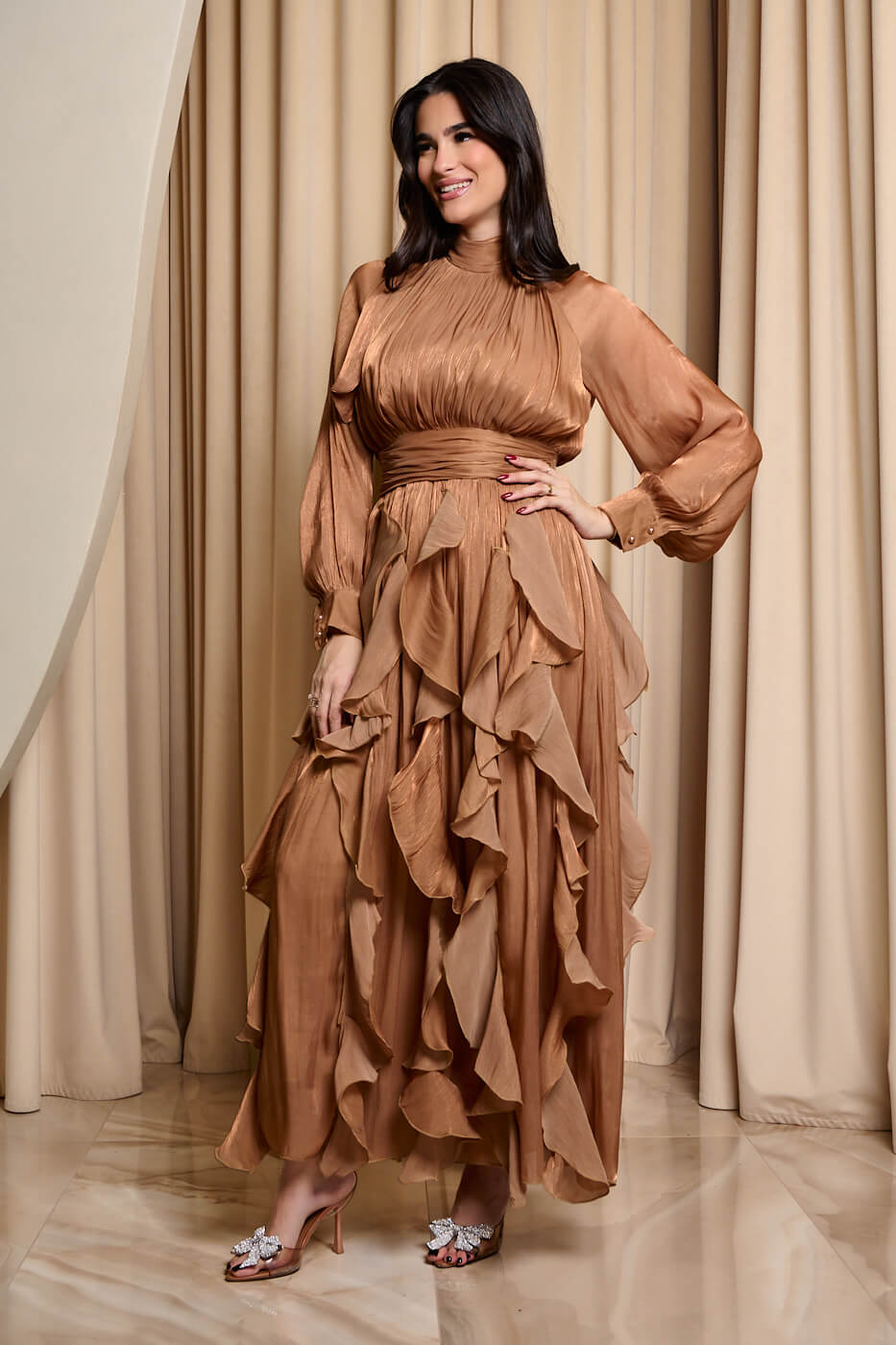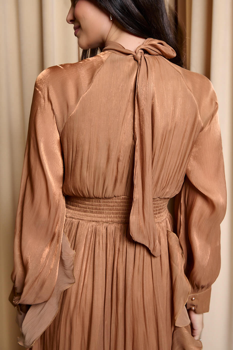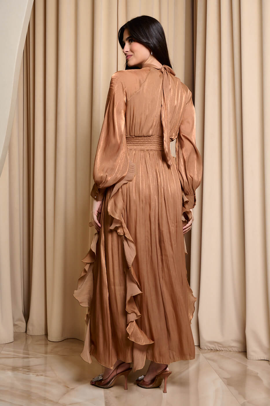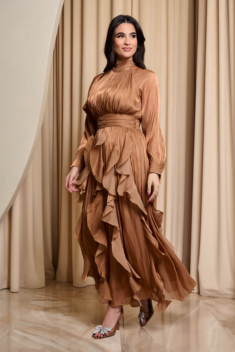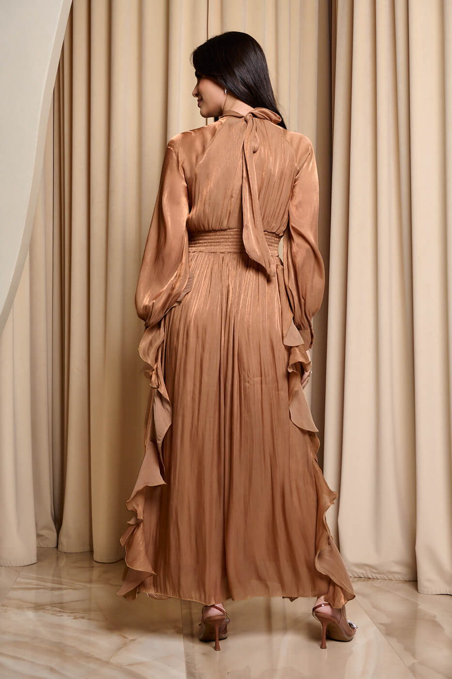 Φόρεμα maxi με βολάν bronze . Αέρινο κομψό και εντυπωσιακό μακρύ φόρεμα στην απόλυτη bronze απόχρωση. Διαθέτει ψηλό λαιμό που δένει πίσω και πλισέ κλειστό μπούστο. Τα μανίκια είναι μακριά ημιδιάφανα με μανσέτα και κουμπιά πέρλες στο τελείωμα. Το λάστιχο και το ίδιο ύφασμα τύπου ζώνη τονίζουν τη μέση και δίνουν ελαστικότητα στο φόρεμα. Το κάτω μέρος είναι αέρινο με βολάν που χαρίζουν κίνηση και ρομαντική διάθεση. Το ύφασμα του είναι ανάλαφρο με διακριτική λάμψη. Διαθέτει εσωτερική φόδρα. Ιδανικό για επίσημες εμφανίσεις που ξεχωρίζουν για το στυλ και την κομψότητα τους.