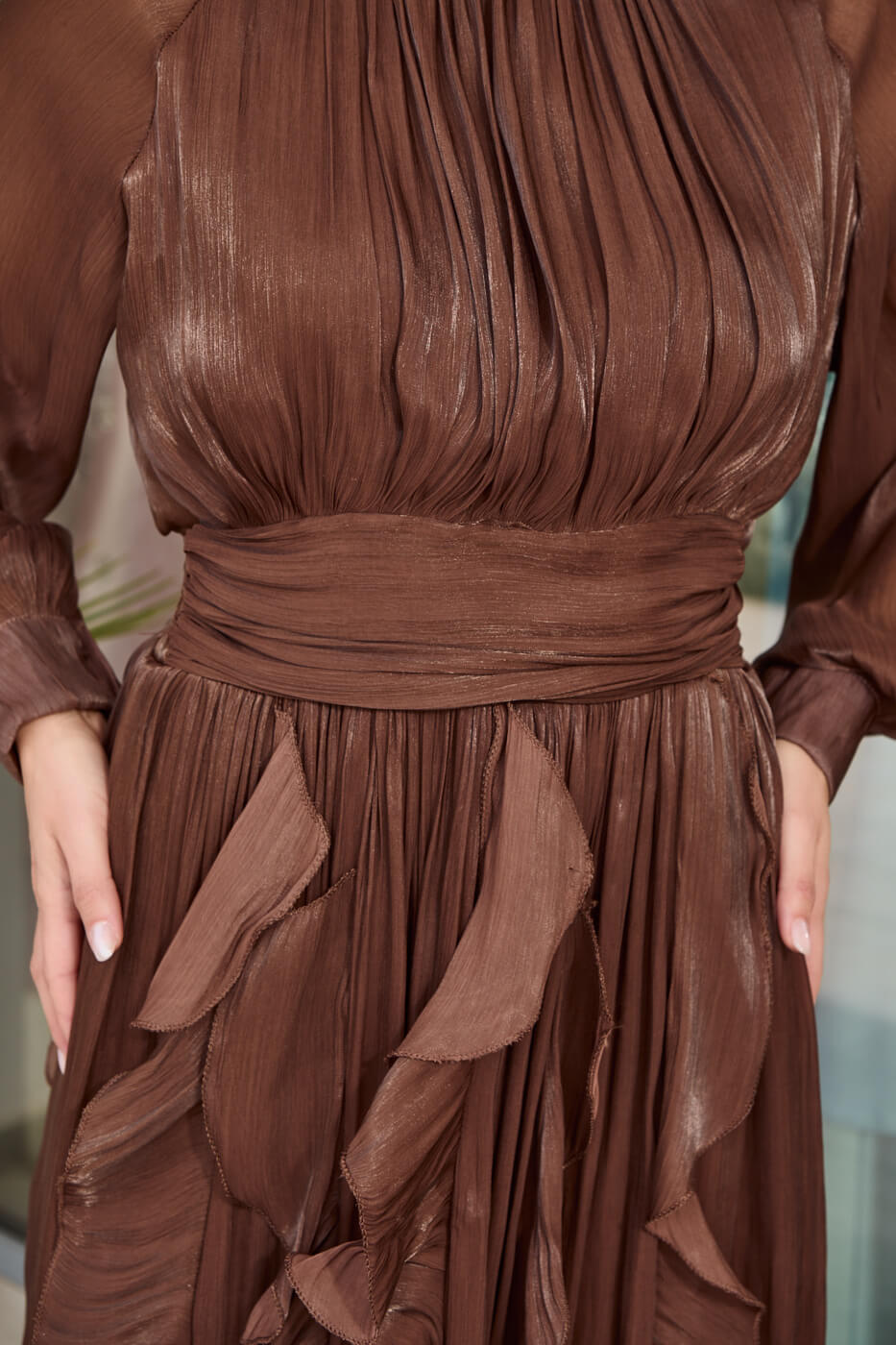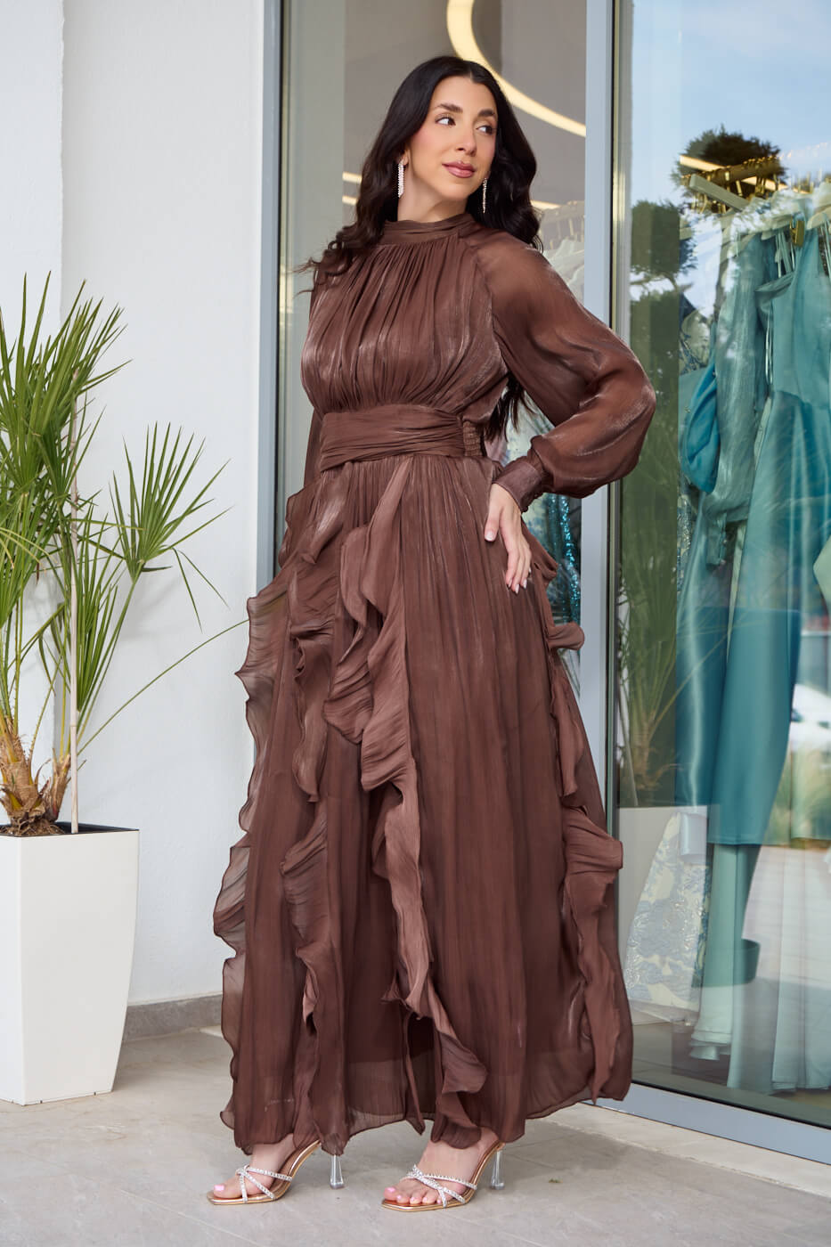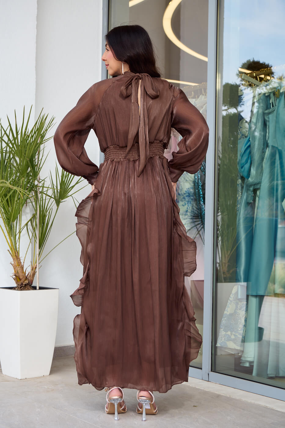 Φόρεμα maxi με βολάν καφέ . Αέρινο κομψό και εντυπωσιακό μακρύ φόρεμα στην απόλυτη καφέ απόχρωση. Διαθέτει ψηλό λαιμό που δένει πίσω και πλισέ κλειστό μπούστο. Τα μανίκια είναι μακριά ημιδιάφανα με μανσέτα και κουμπιά πέρλες στο τελείωμα. Το λάστιχο και το ίδιο ύφασμα τύπου ζώνη τονίζουν τη μέση και δίνουν ελαστικότητα στο φόρεμα. Το κάτω μέρος είναι αέρινο με βολάν που χαρίζουν κίνηση και ρομαντική διάθεση. Το ύφασμα του είναι ανάλαφρο με διακριτική λάμψη. Διαθέτει εσωτερική φόδρα. Ιδανικό για επίσημες εμφανίσεις που ξεχωρίζουν για το στυλ και την κομψότητα τους.