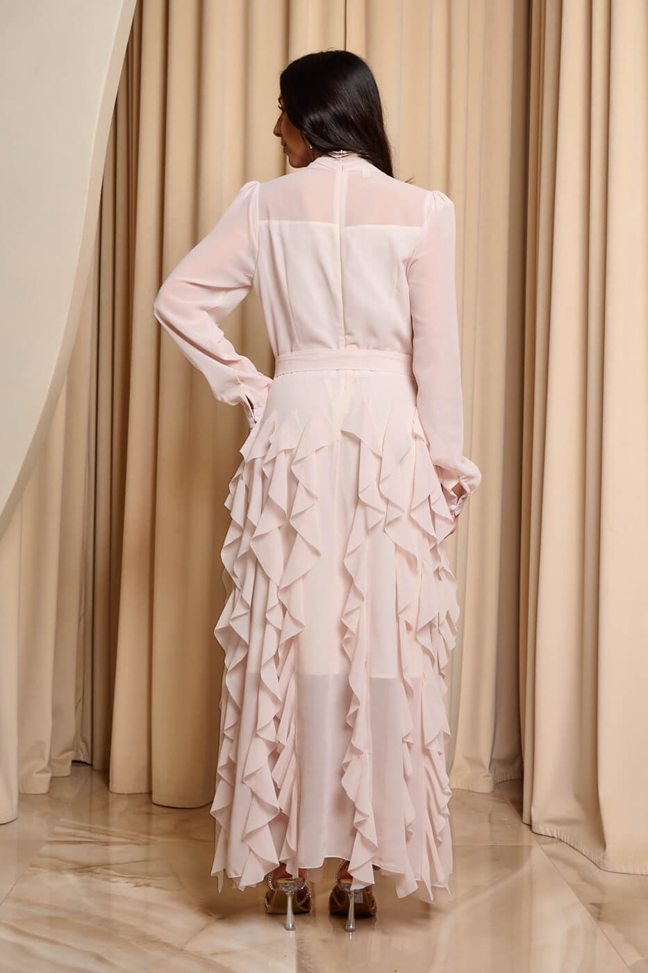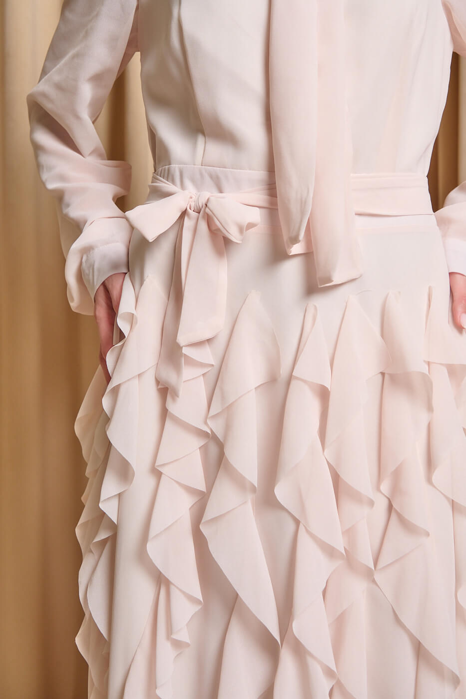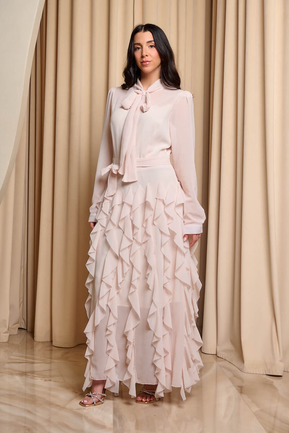 Φόρεμα maxi με βολάν και ζώνη μπεζ . Αέρινο κομψό και εντυπωσιακό μακρύ φόρεμα σε διαχρονική μπεζ απόχρωση. Διαθέτει δέσιμο στο λαιμό και δική του αποσπώμενη ζώνη από το ίδιο ύφασμα. Τα μανίκια είναι μακριά ημιδιάφανα με μανσέτα και κουμπί στο τελείωμα. Το κάτω μέρος είναι αέρινο με βολάν που χαρίζουν κίνηση και ρομαντική διάθεση. Το ύφασμα του είναι ανάλαφρο και ημιδιάφανο. Διαθέτει εσωτερική φόδρα και κλείνει με φερμουάρ πίσω. Ιδανικό για επίσημες εμφανίσεις που ξεχωρίζουν για το στυλ και την κομψότητα τους.