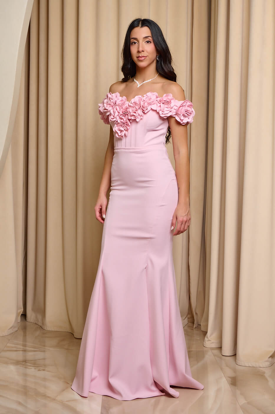 Φόρεμα maxi off shoulder γοργονέ με 3D λουλούδια baby pink . Ένα εντυπωσιακό και κομψό φόρεμα σε baby pink απόχρωση. Διαθέτει μπούστο – κορσέ σε σχήμα καρδιάς με ενσωματωμένα cups , 3D λουλούδια και off shoulder κόψιμο στο πάνω μέρος. Η γοργονέ γραμμή του αγκαλιάζει ωραία το σώμα και αναδεικνύει τη σιλουέτα. Το κομψό σκίσιμο κάτω δίνει άνεση στην κίνηση. Διαθέτει εσωτερική φόδρα και κλείνει με φερμουάρ πίσω. Ένα θηλυκό φόρεμα με ρομαντική διάθεση για κομψές επίσημες εμφανίσεις που ξεχωρίζουν.