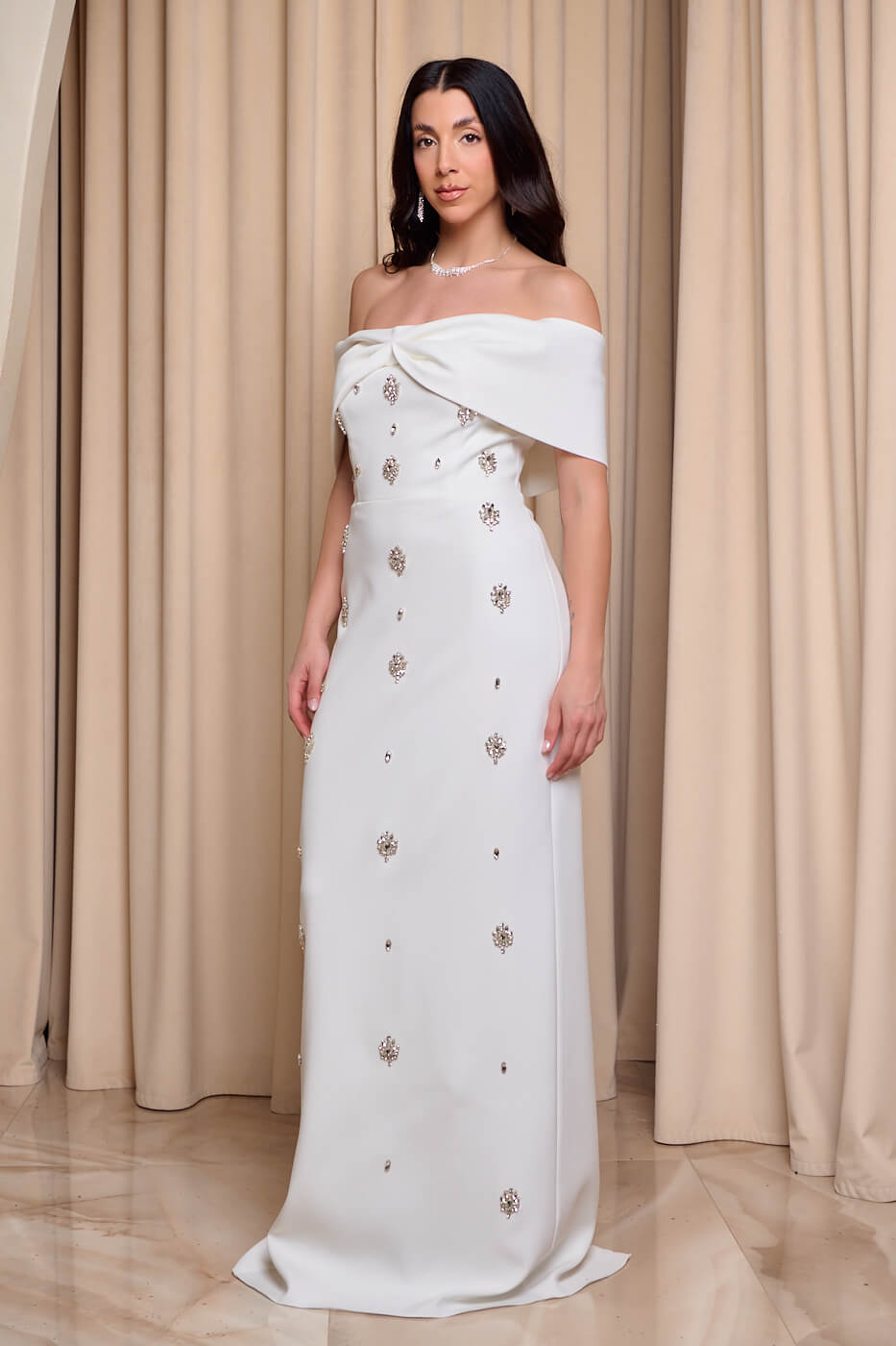 • Φόρεμα maxi off shoulder με διακοσμητικές πέτρες άσπρο