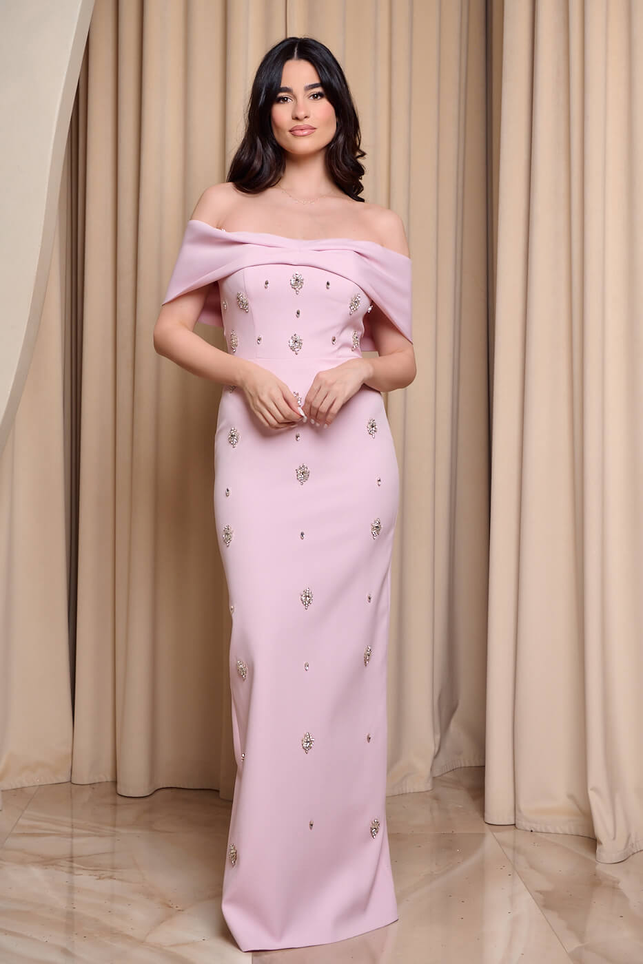 Φόρεμα maxi off shoulder με διακοσμητικές πέτρες baby pink