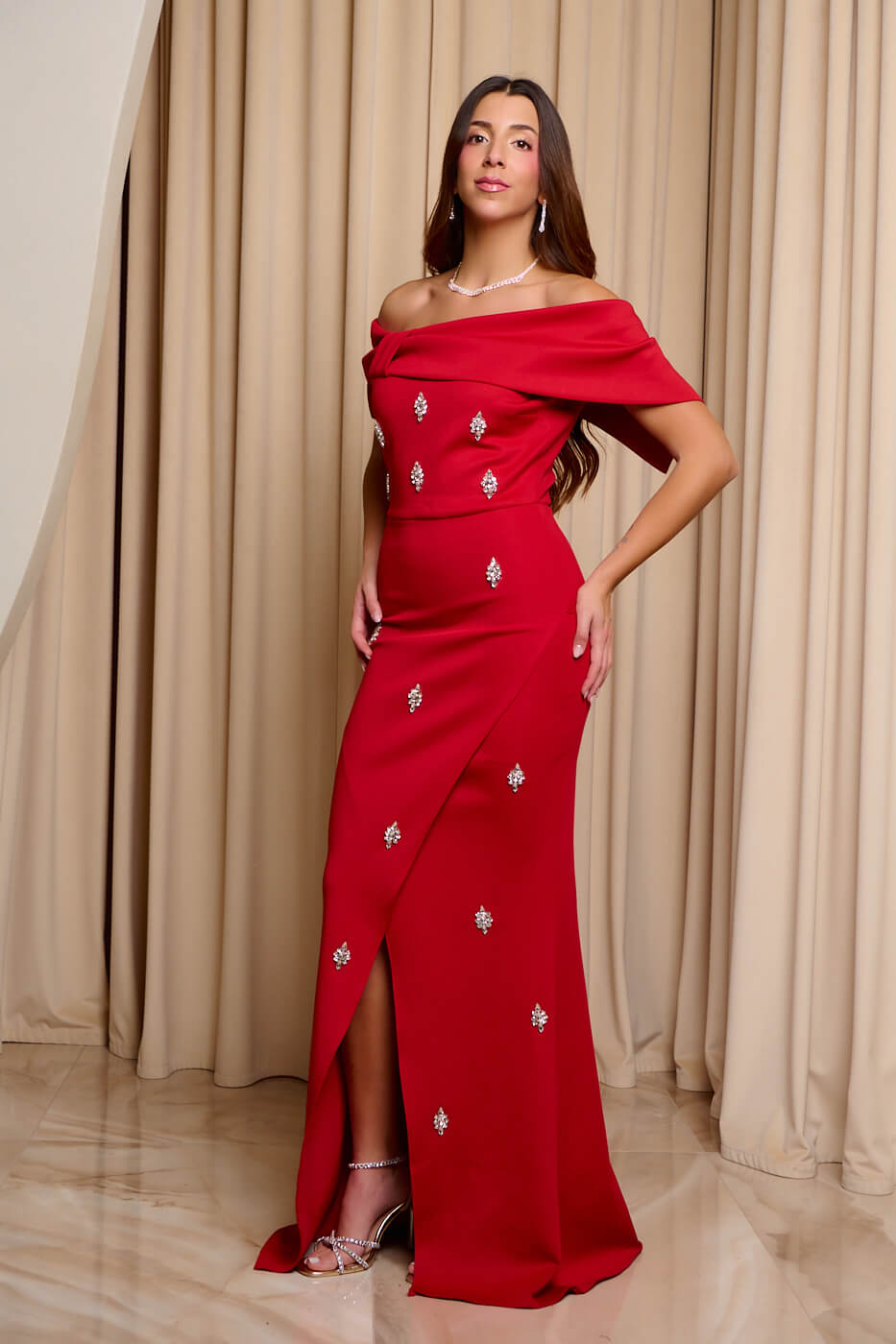 Φόρεμα maxi off shoulder με διακοσμητικές πέτρες κόκκινο. Ένα εντυπωσιακό φόρεμα σε κόκκινη απόχρωση με off shoulder πάνω μέρος σε σχήμα φιόγκου. Διαθέτει διακοσμητικές λαμπερές πέτρες σε όλο το μήκος του που προσθέτουν μια διακριτική λεπτομέρεια. Έχει εφαρμοστή γραμμή που αγκαλιάζει τη σιλουέτα και άνοιγμα στο μπροστινό μέρος για άνεση στο περπάτημα και ανάδειξη της γραμμής του φορέματος. Κλείνει με φερμουάρ πίσω και διαθέτει εσωτερική φόδρα. Ένα φόρεμα που συνδυάζει διαχρονική κομψότητα με λαμπερή λεπτομέρεια και δημιουργεί εμφανίσεις που δεν περνούν απαρατήρητες.