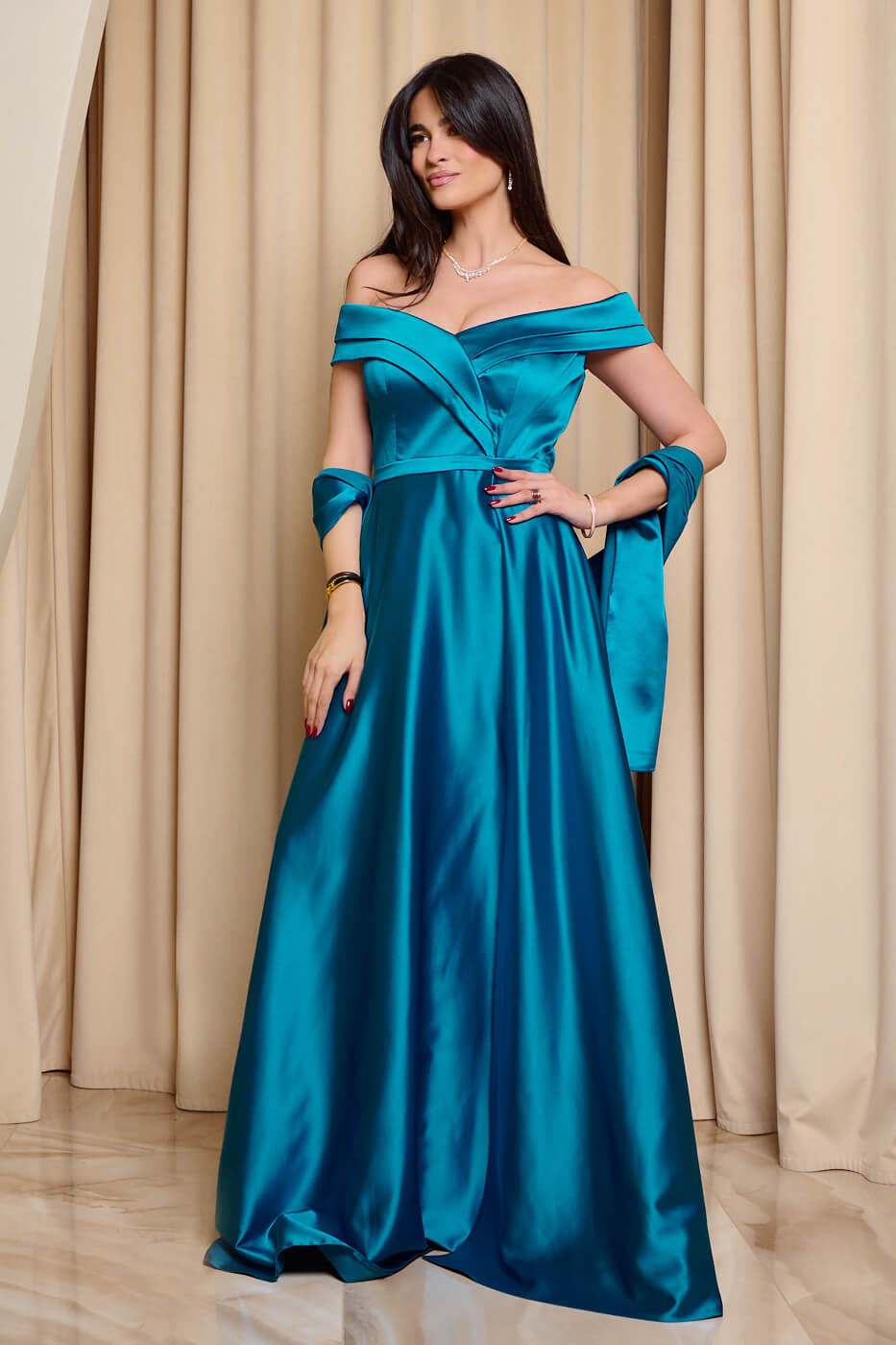 Φόρεμα maxi off shoulder σατέν με κρουαζέ μπούστο βεραμάν