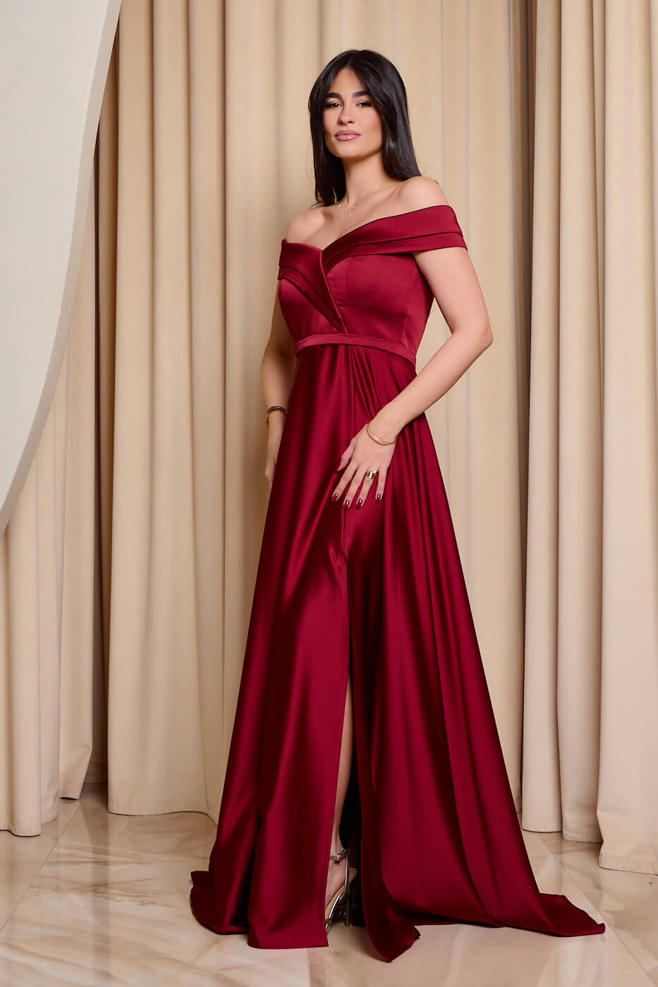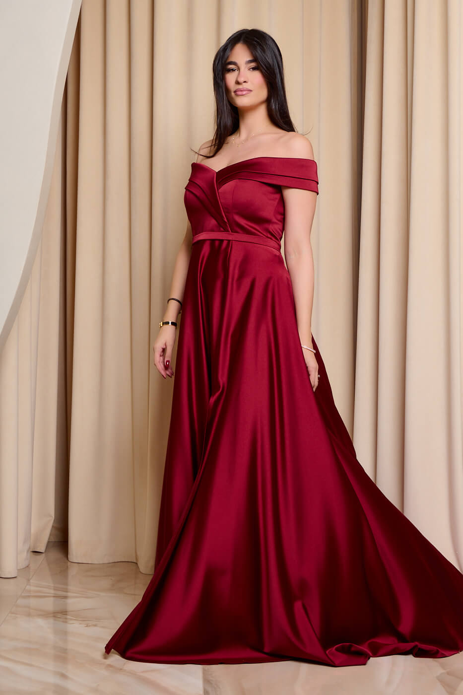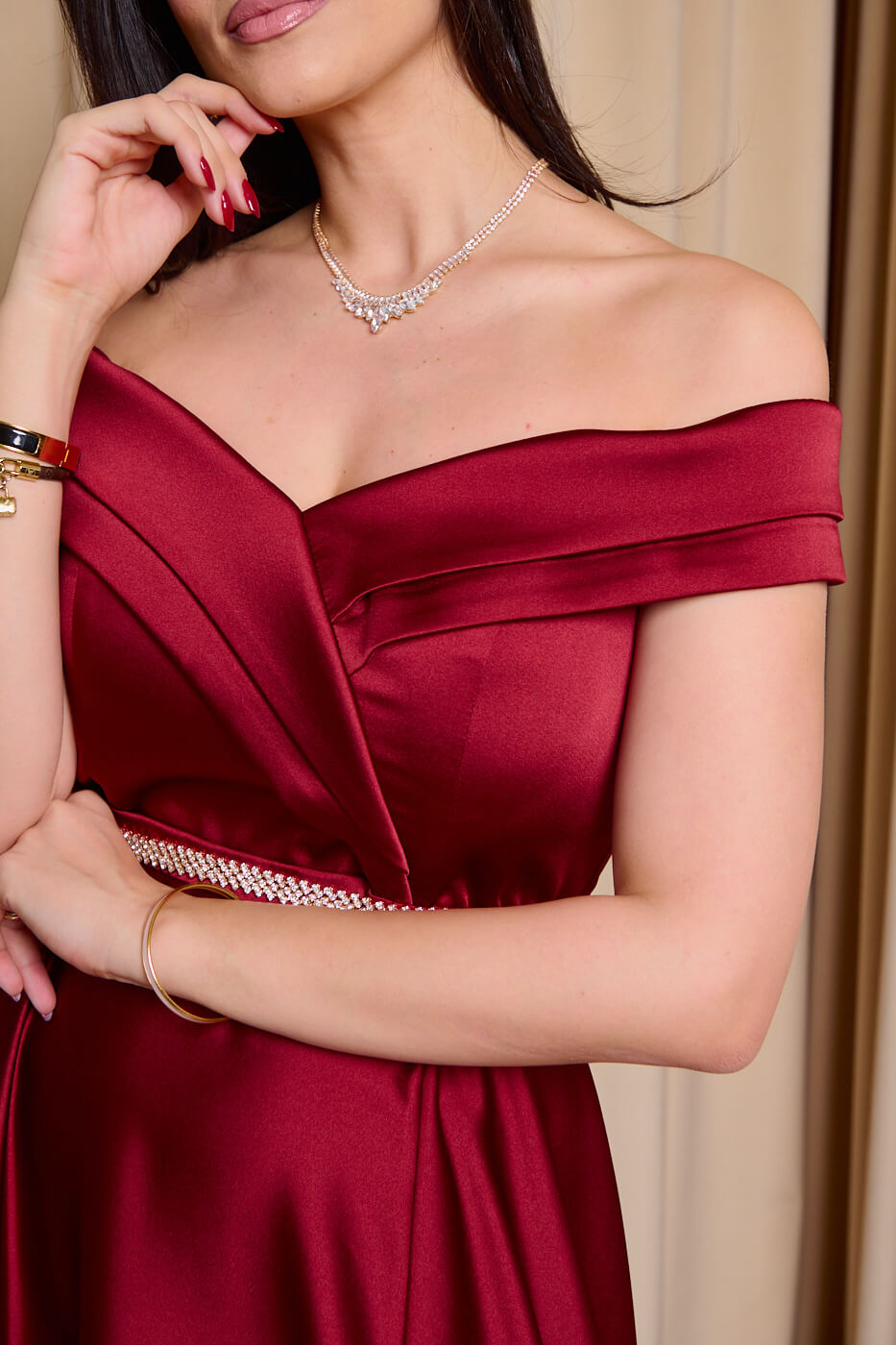 Φόρεμα maxi off shoulder σατέν με κρουαζέ μπούστο βουργουνδί