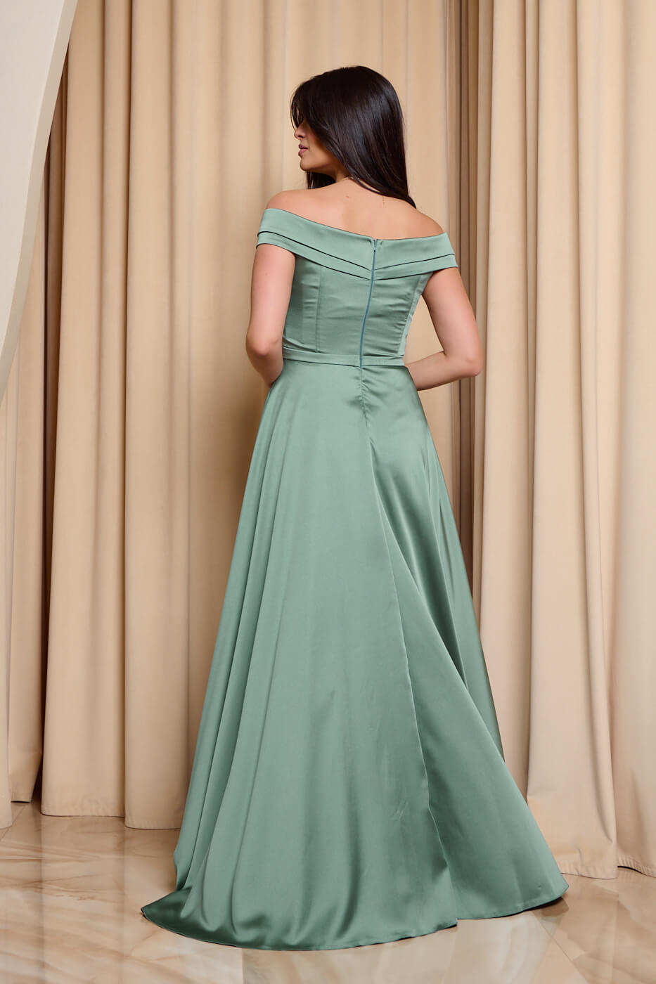Φόρεμα maxi off shoulder σατέν με κρουαζέ μπούστο μέντα