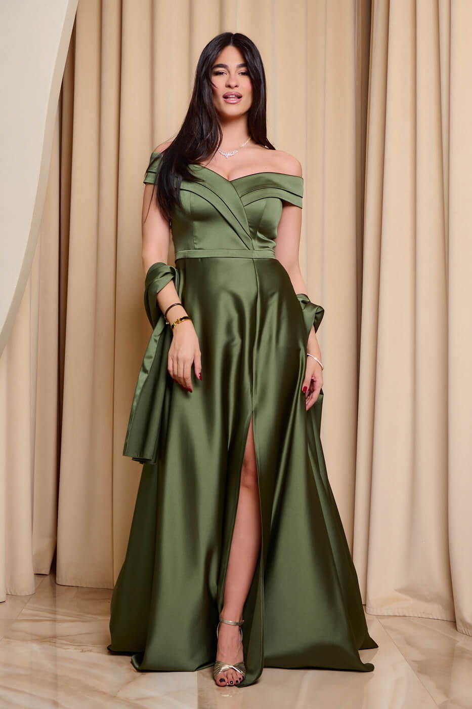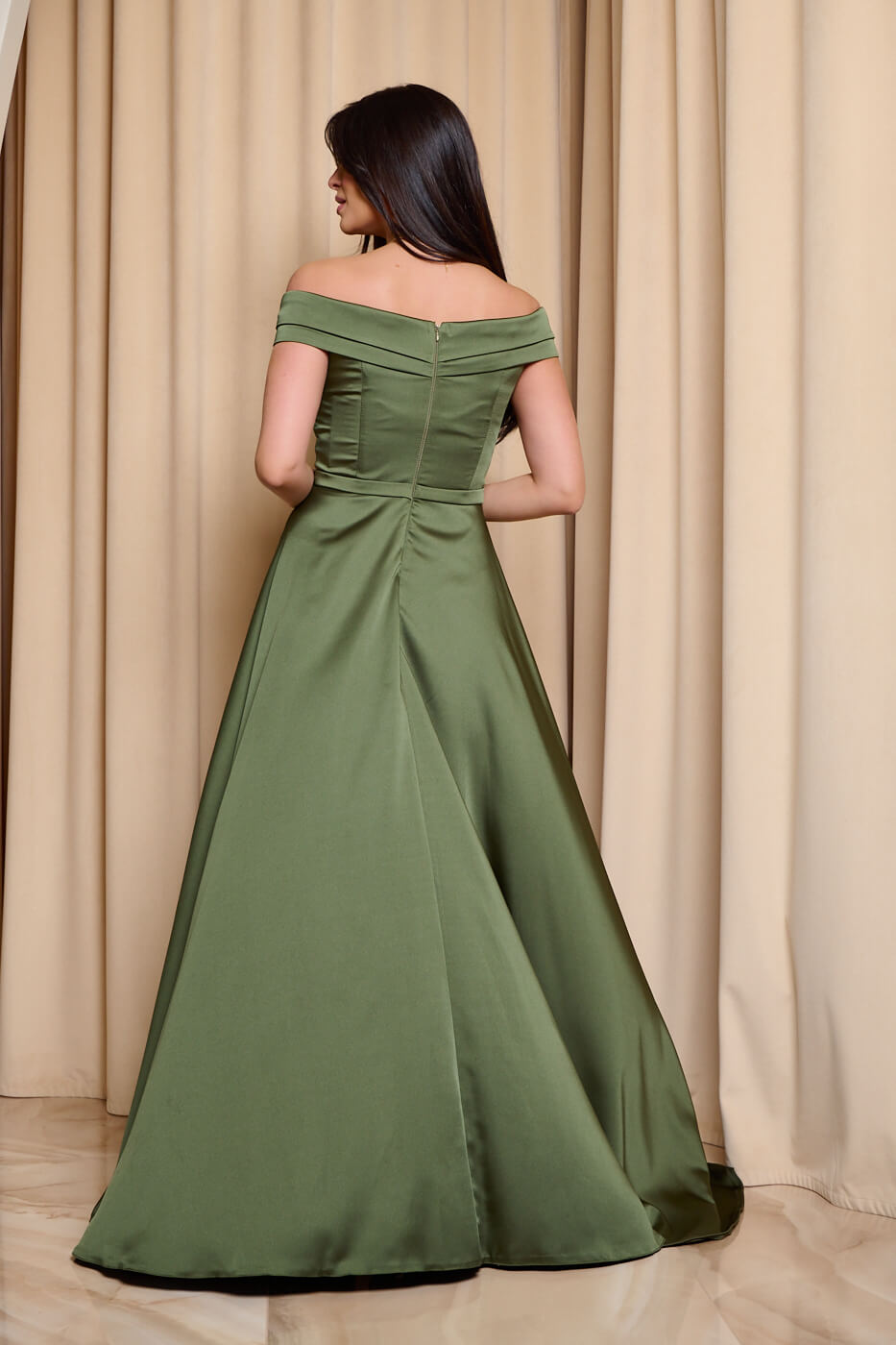 Φόρεμα maxi off shoulder σατέν με κρουαζέ μπούστο olive. Ένα εντυπωσιακό και κομψό σατέν φόρεμα σε olive απόχρωση . Διαθέτει off shoulder κόψιμο και κρουαζέ μπούστο με ντραπέ λεπτομέρειες που αναδεικνύουν το ντεκολτέ και τονίζουν τη θηλυκότητα. Η ενσωματωμένη ζώνη από το ίδιο ύφασμα τονίζει διακριτικά τη μέση. Το κάτω μέρος είναι σε άλφα γραμμή με διακριτικό σκίσιμο. Διαθέτει εσωτερική φόδρα και εσάρπα. Κλείνει με φερμουάρ πίσω. Το ιδανικό φόρεμα για επίσημες κομψές εμφανίσεις που σίγουρα θα κλέψουν τις εντυπώσεις.