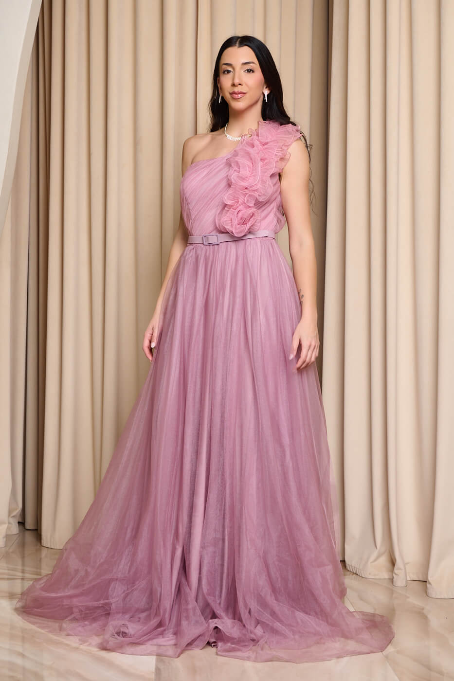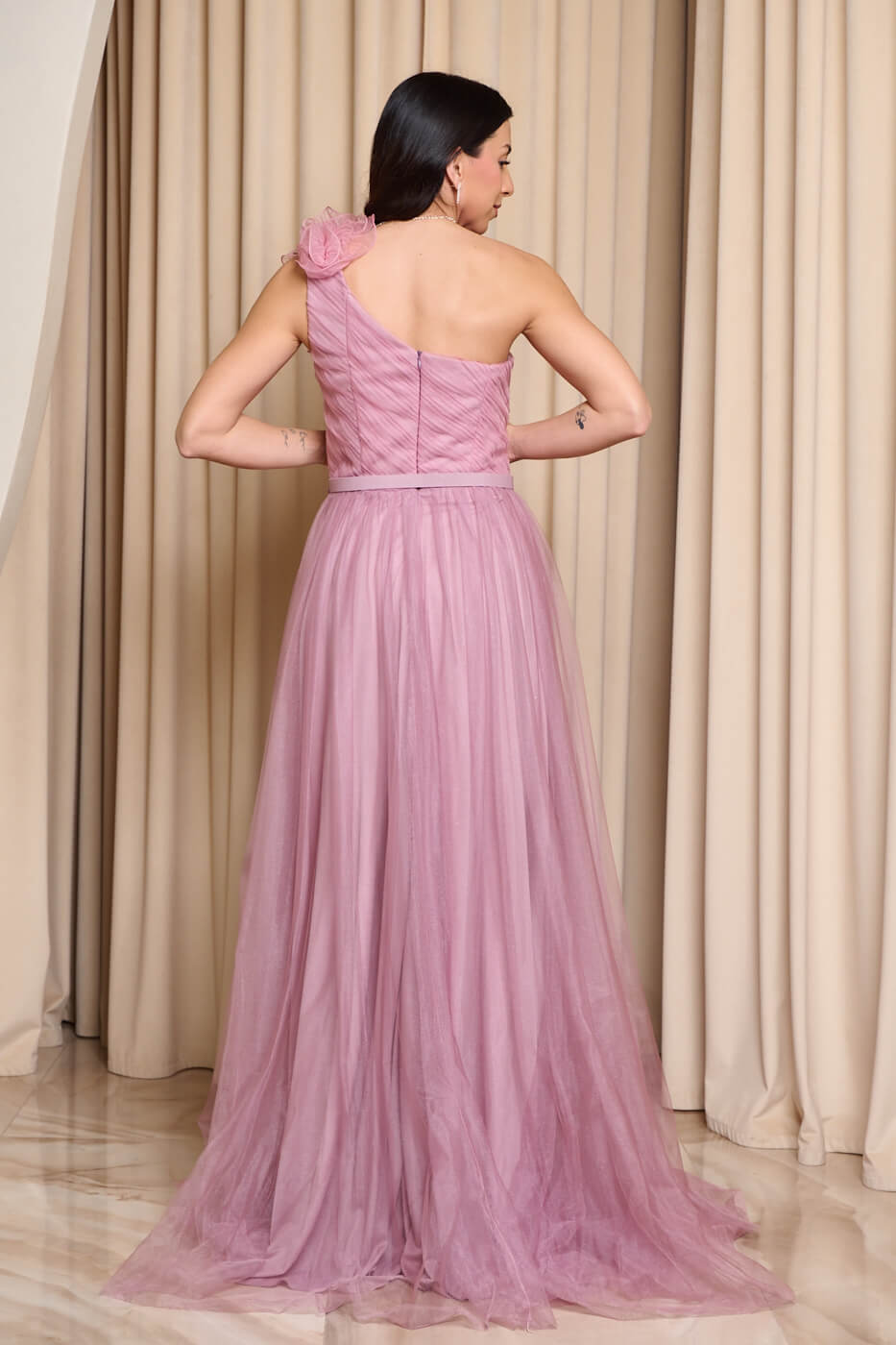 Φόρεμα maxi one shoulder με 3D λεπτομέρεια λιλά. Εντυπωσιακό τούλινο maxi φόρεμα με ρομαντική αισθητική. Το πάνω μέρος είναι one shoulder με πιέτες και 3D λεπτομέρεια στον έναν ώμο. Διαθέτει εσωτερικά cups και δική του αποσπώμενη ζώνη στην ίδια απόχρωση. Το κάτω μέρος είναι σε άλφα γραμμή με πολύ ωραία κίνηση. Έχει εσωτερική φόδρα και κλείνει με φερμουάρ πίσω. Ιδανικό για επίσημες εμφανίσεις που αποπνέουν ρομαντισμό.