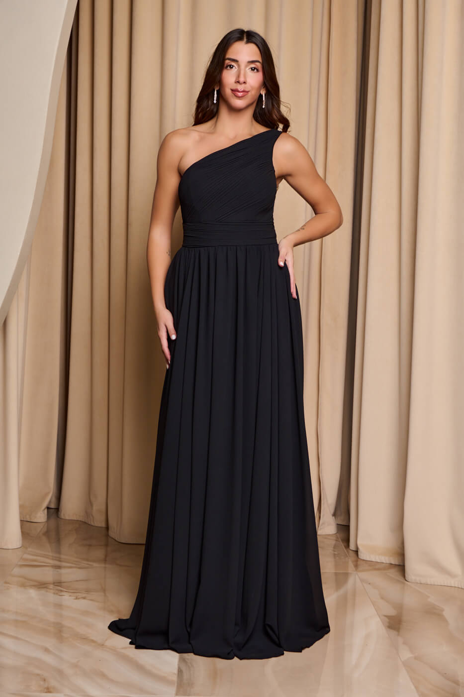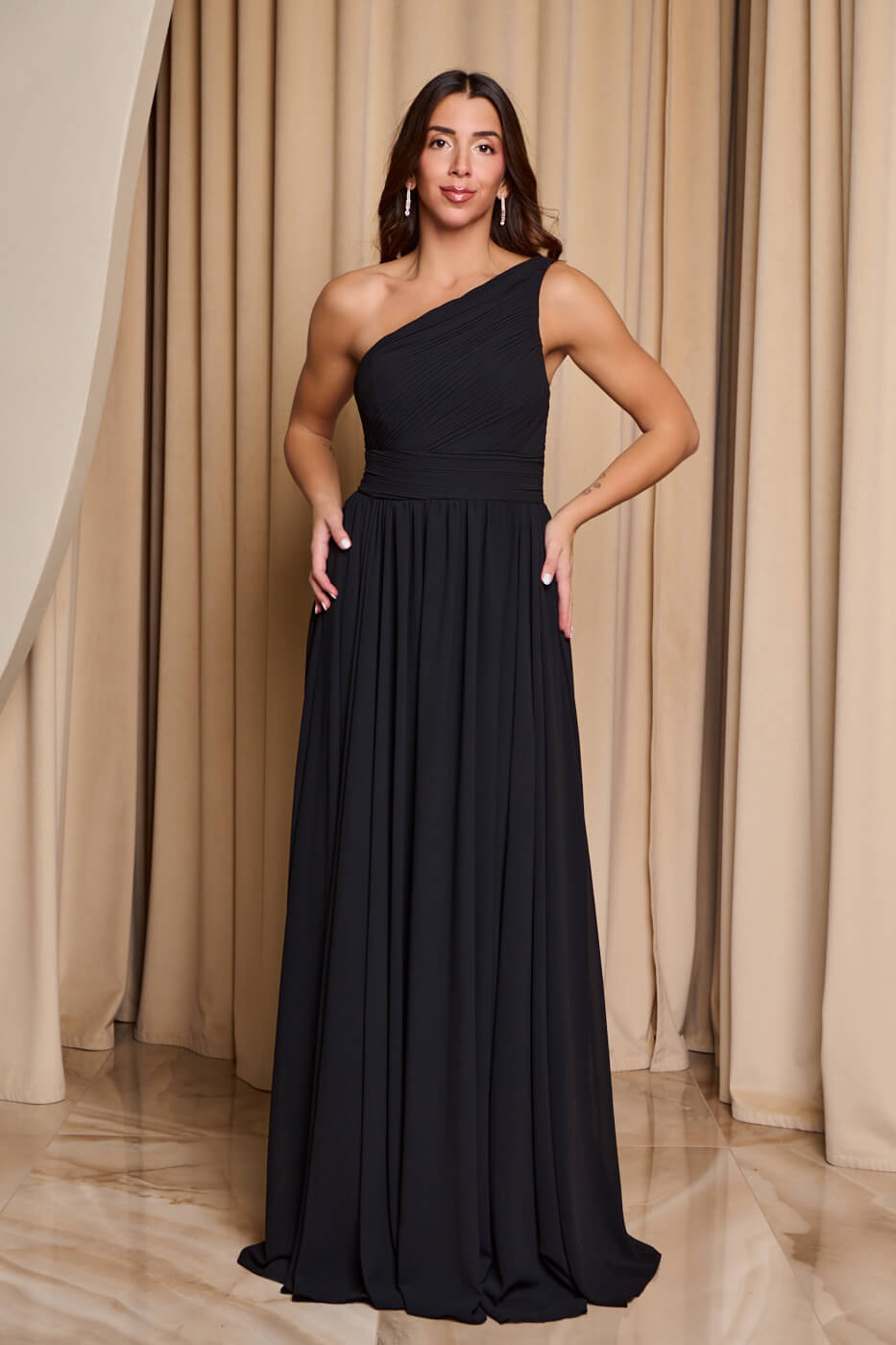 Φόρεμα maxi one shoulder με πλισέ σχέδιο στο μπούστο μαύρο. Με σφηκοφωλιά στο πίσω μέρος για ελαστικότητα και σχέδιο με πλισέ στο μπούστο και στην μέση. Είναι one shoulder και έχει αυξομειωμένη τιράντα στον άλλο. Διαθέτει cups και εσωτερική φόδρα.