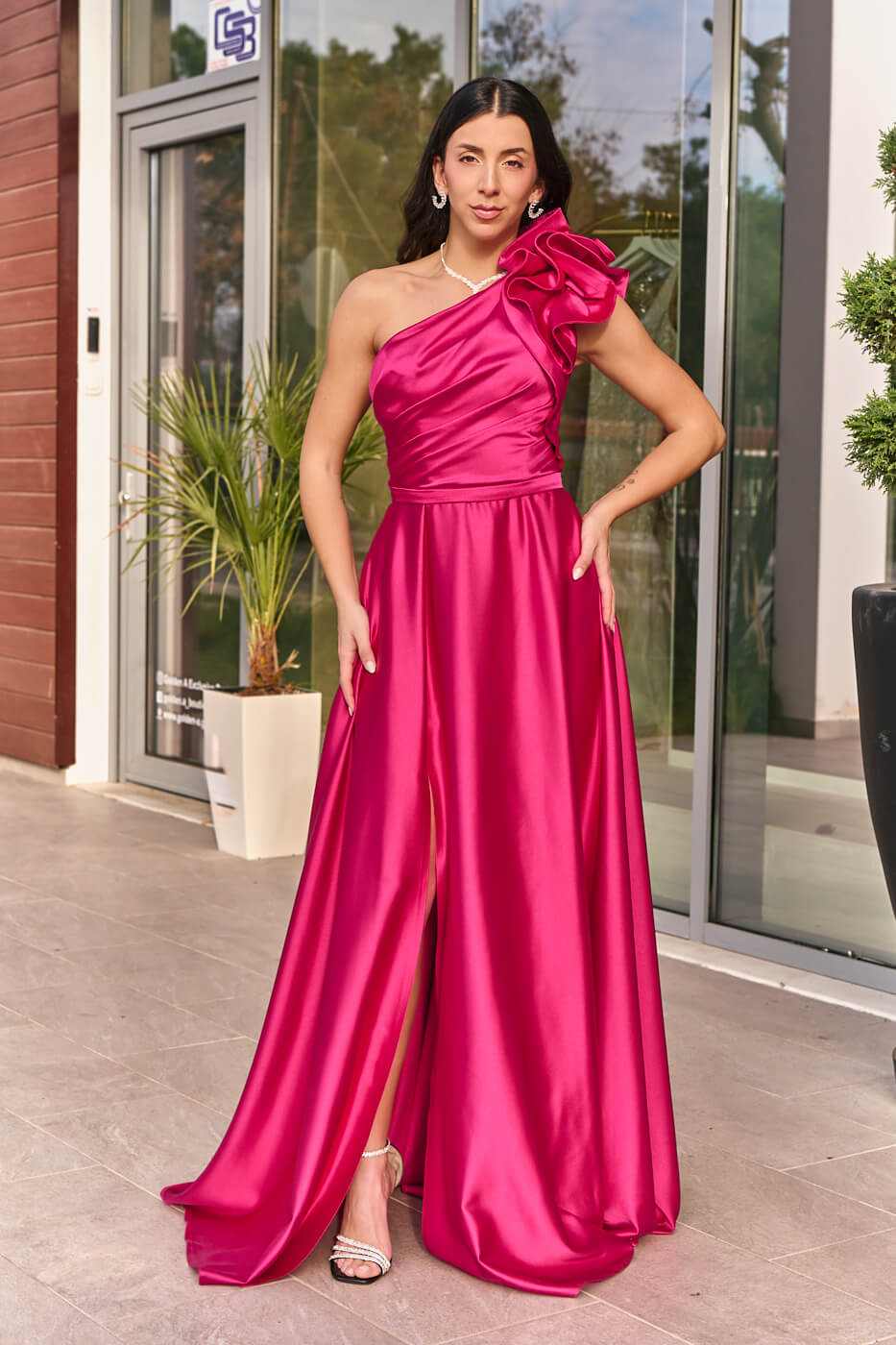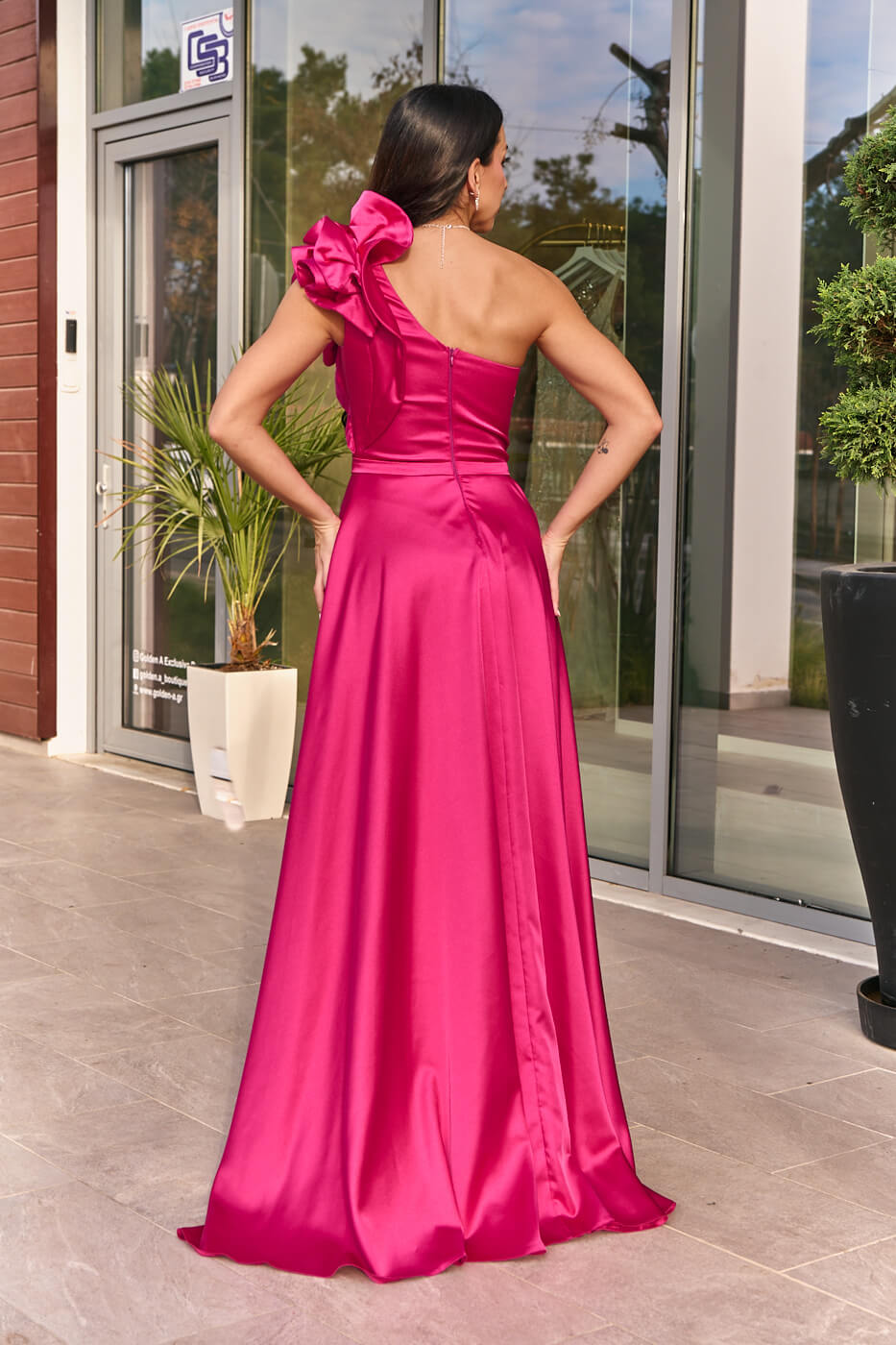 Φόρεμα maxi one shoulder σατέν με φραμπαλά ματζέντα