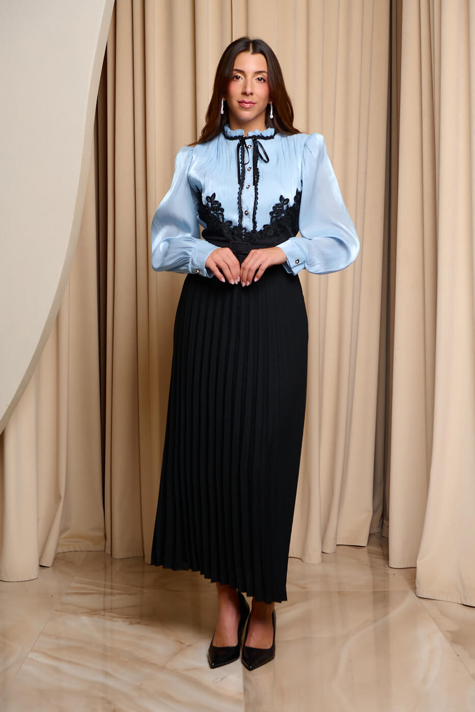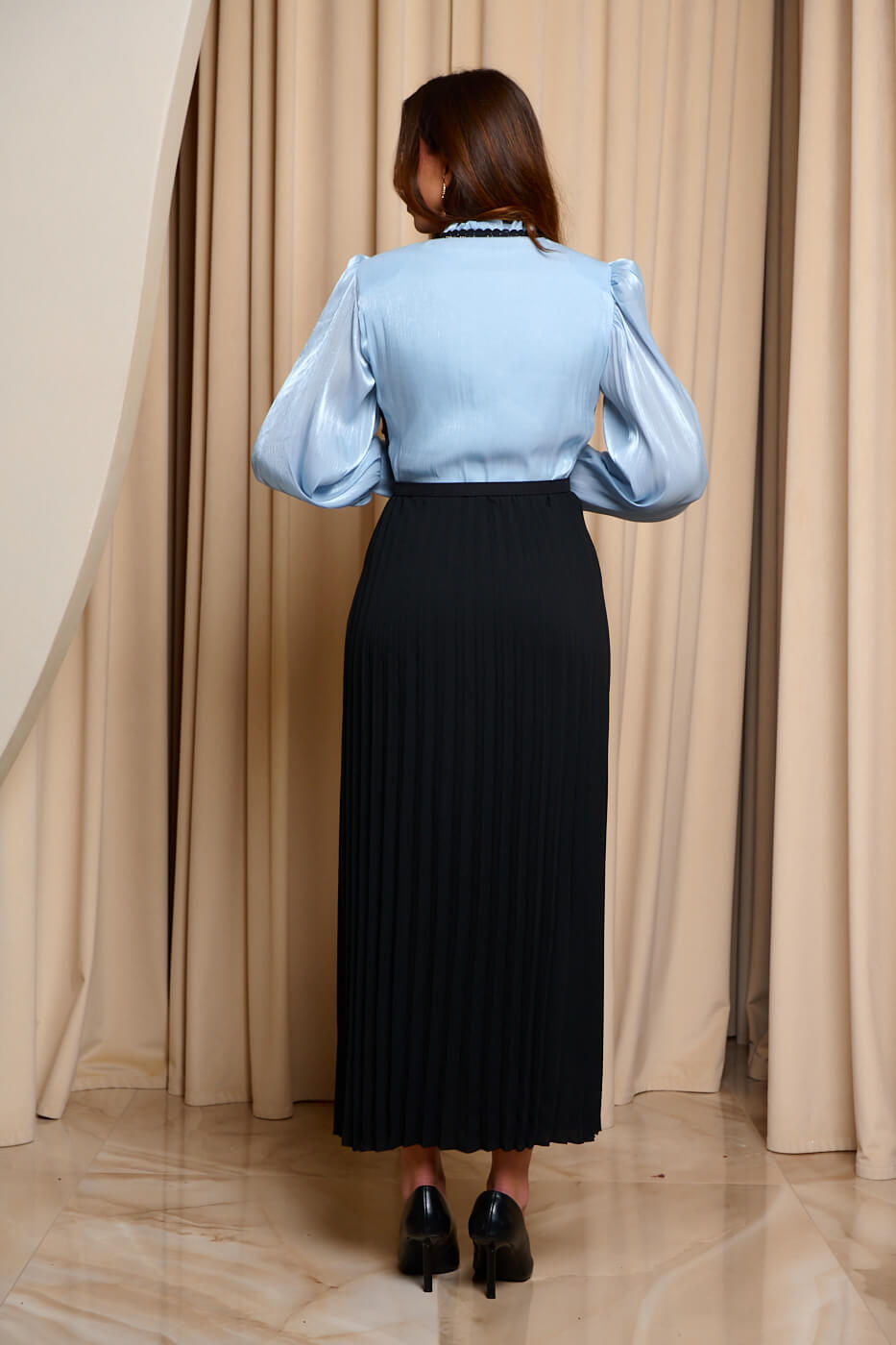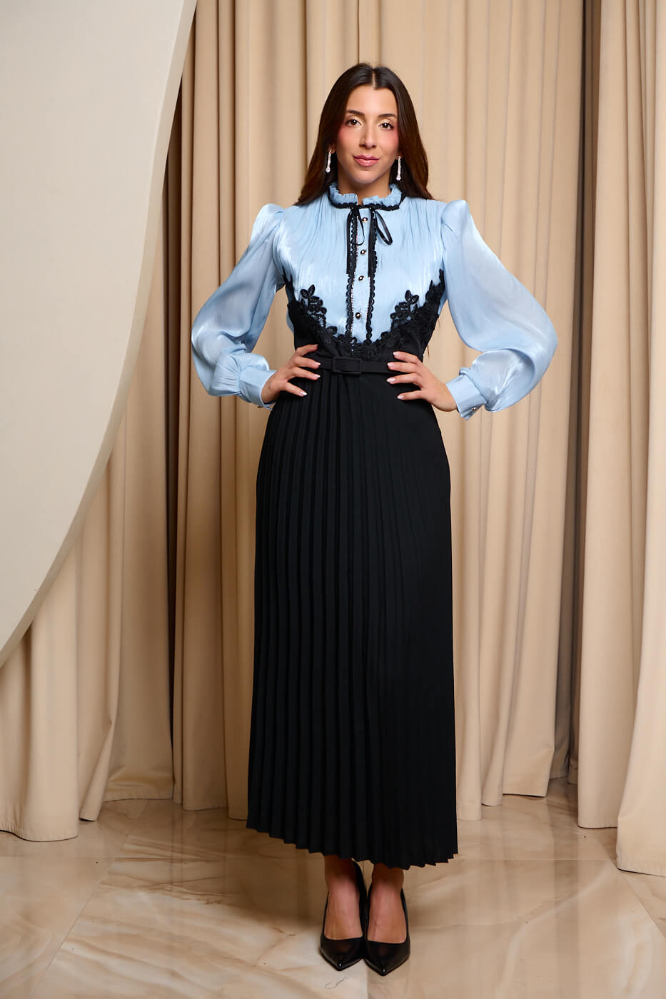 Φόρεμα maxi πλισέ μαύρο – γαλάζιο . Το επάνω μέρος είναι σαν πουκάμισο γαλάζιο με ύφασμα που έχει διακριτική λάμψη , κουμπιά – κόσμημα και βάτες στους ώμους. Οι μαύρες δαντελωτές λεπτομέρειες στο γιακά, στους ώμους και κατά μήκος του φορέματος προσθέτουν μια ρομαντική νότα στο φόρεμα. Διαθέτει μικρό βολάν στη λαιμόκοψη και κορδέλα που δένει στο λαιμό. Τα μανίκια καταλήγουν σε μικρή μανσέτα με διακοσμητικό κουμπί – κόσμημα. Το κάτω μέρος είναι μαύρο πλισέ με εσωτερική φόδρα. Κλείνει με φερμουάρ στο πλάι και έχει δική του αποσπώμενη ζώνη. Ένα ιδιαίτερο φόρεμα με ρομαντική διάθεση για εμφανίσεις που ξεχωρίζουν.