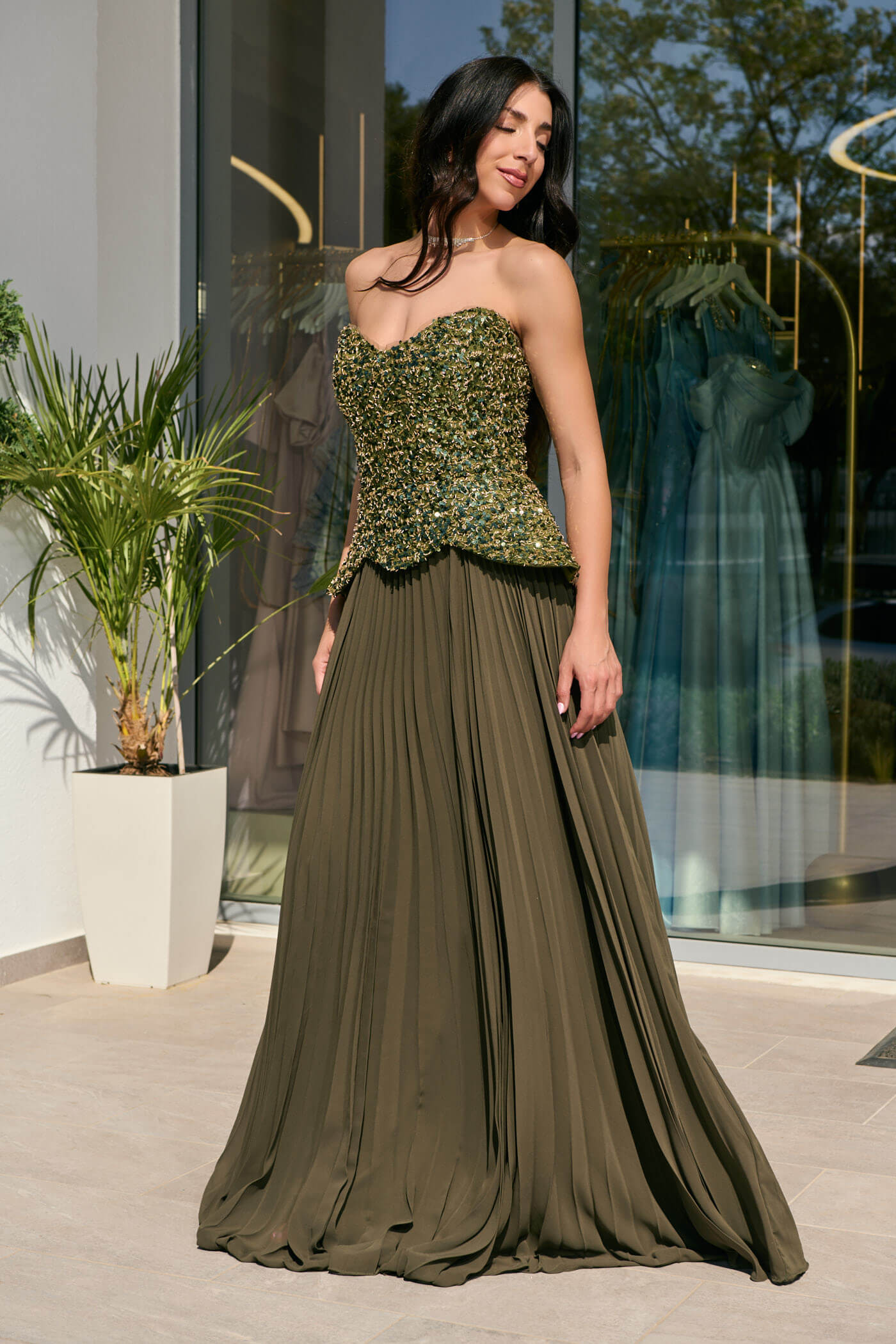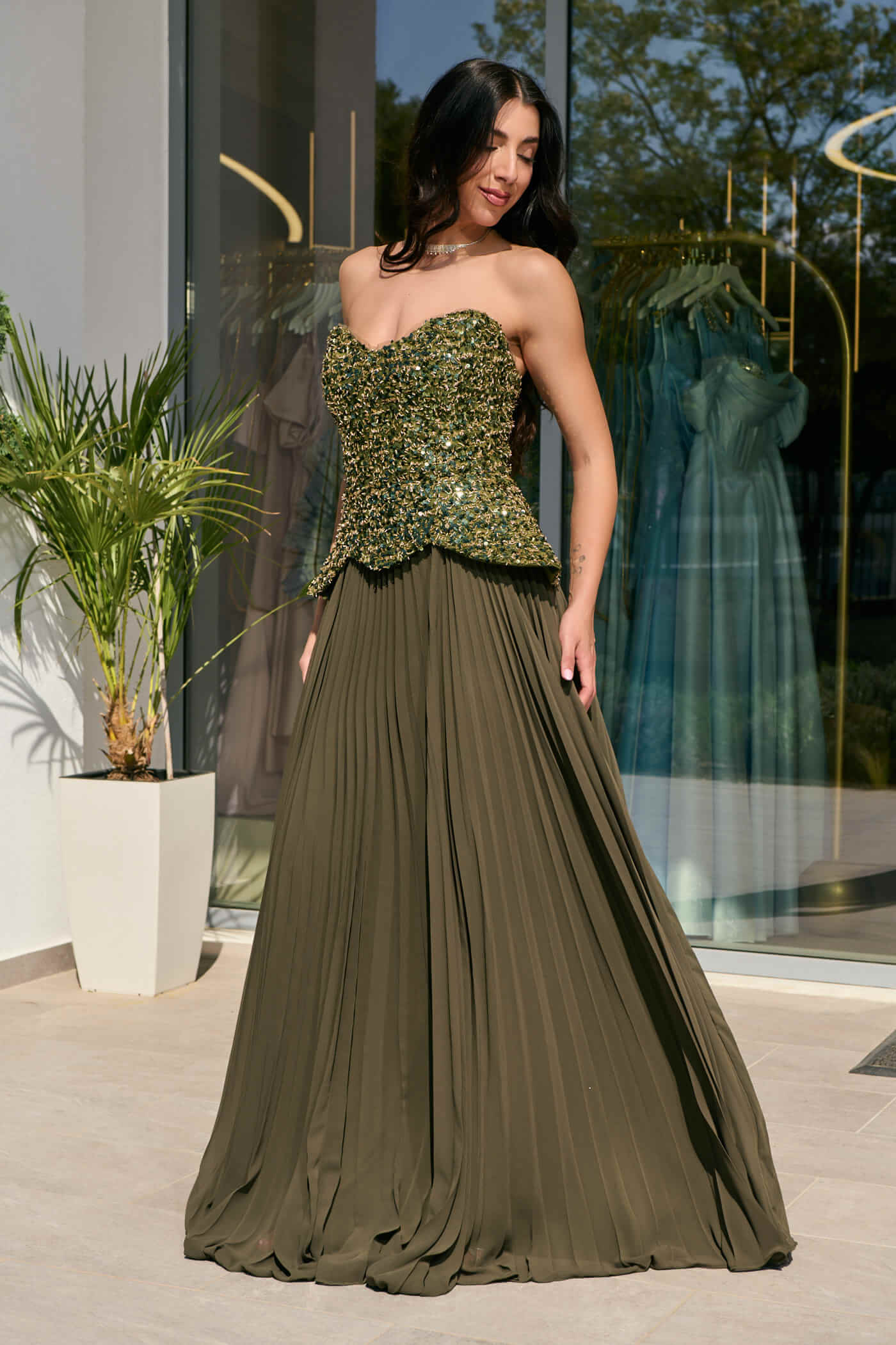 Φόρεμα maxi πλισέ με πέπλουμ λεπτομέρεια olive . Ένα άκρως κομψό και εντυπωσιακό φόρεμα στην απόλυτη olive απόχρωση. Το πάνω μέρος είναι στράπλες με παγιέτες και ιδιαίτερο πέπλουμ τελείωμα που κολακεύει τη μέση. Το κάτω μέρος είναι πλισέ σε άλφα γραμμή με πολύ ωραία κίνηση. Διαθέτει εσωτερική φόδρα και cups στο μπούστο. Κλείνει με φερμουάρ πίσω. Ιδανικό για λαμπερές επίσημες εμφανίσεις που ξεχωρίζουν για το στυλ και την κομψή αισθητική τους.