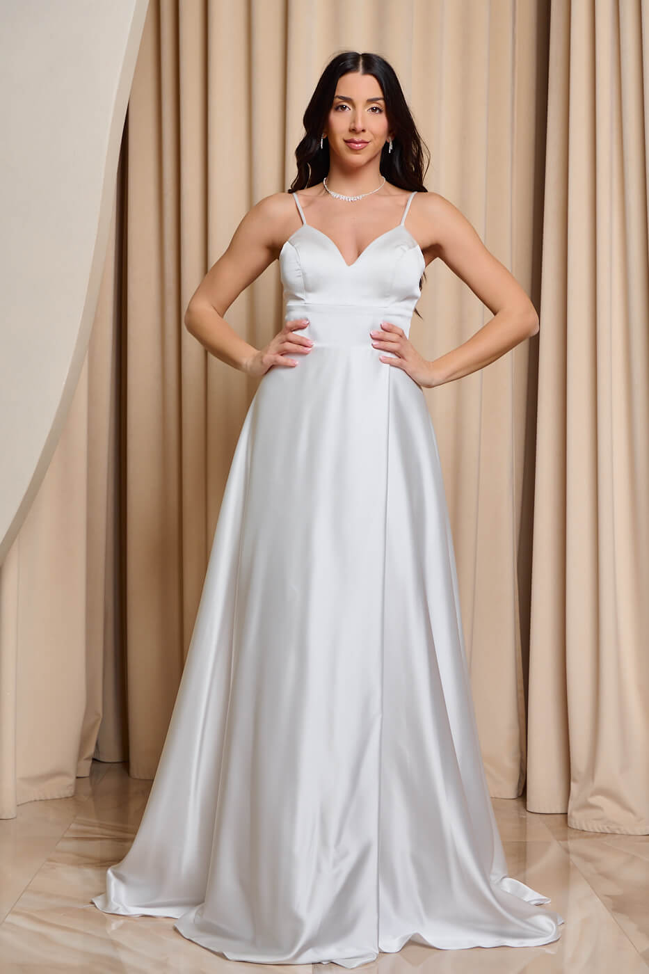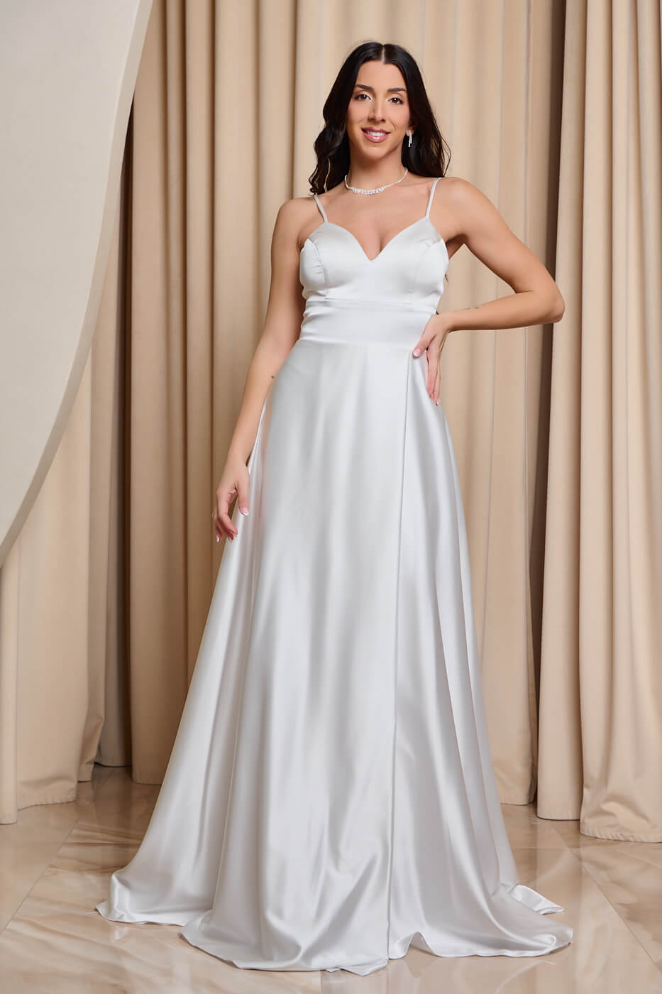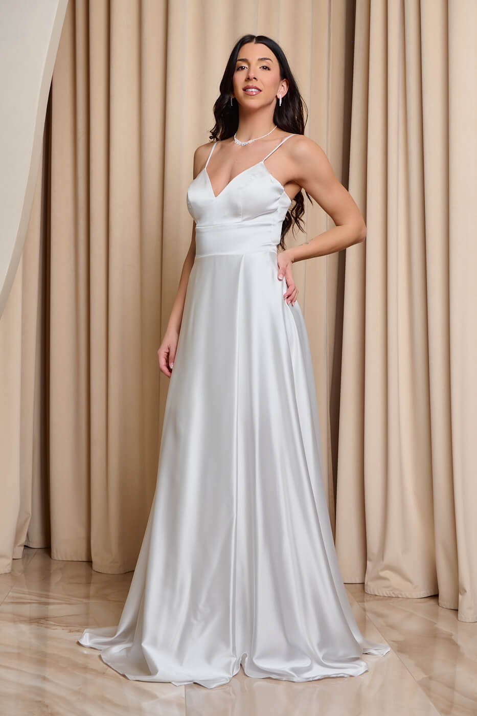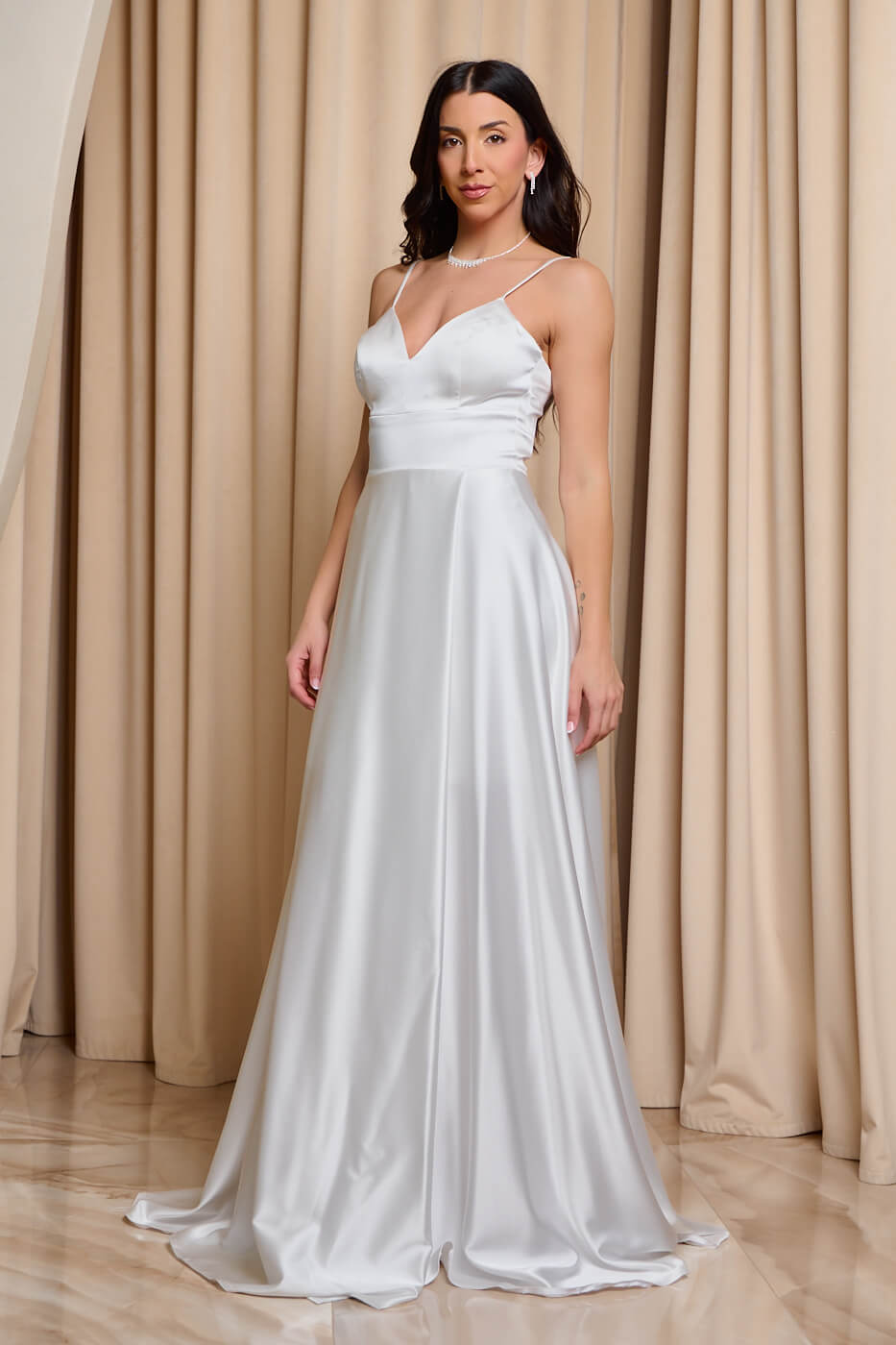 Φόρεμα maxi σατέν άσπρο . Κομψό και αέρινο maxi φόρεμα στην πιο διαχρονική και κομψή λευκή απόχρωση. Το πάνω μέρος έχει λεπτές τιράντες και εσωτερικά cups στο μπούστο. Το κάτω μέρος είναι σε άλφα γραμμή με κρουαζέ κόψιμο και πολύ ωραία κίνηση. Διαθέτει εσωτερική φόδρα και κλείνει με δέσιμο κορσέ και φερμουάρ πίσω. Ιδανικό για επίσημες εμφανίσεις που ξεχωρίζουν για την κομψότητα και τη διαχρονική αισθητική τους. Κατάλληλο και για νυφικό φόρεμα.
