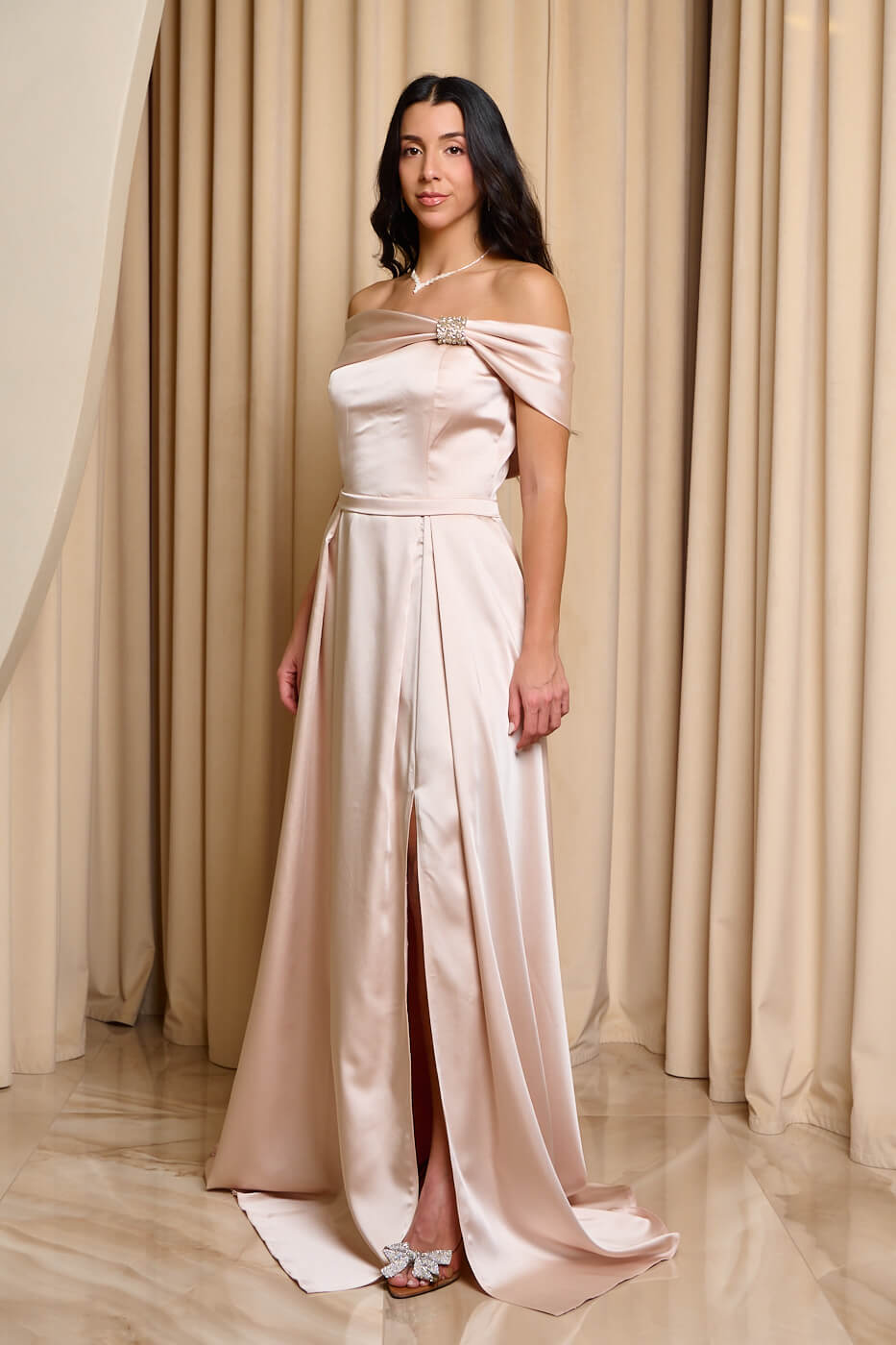 Φόρεμα maxi σατέν off shoulder με λεπτομέρεια κόσμημα ιβουάρ