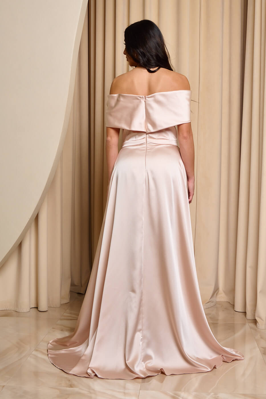 Διαθέτει off shoulder κόψιμο στο πάνω μέρος με εφέ φιόγκου και κόσμημα με στρας. Έχει εσωτερικά cups και εσάρπα στην ίδια απόχρωση. Το κάτω μέρος είναι σε άλφα γραμμή με πιέτες και κομψό σκίσιμο στο πλάι. Διαθέτει εσωτερική φόδρα και κλείνει με φερμουάρ πίσω.