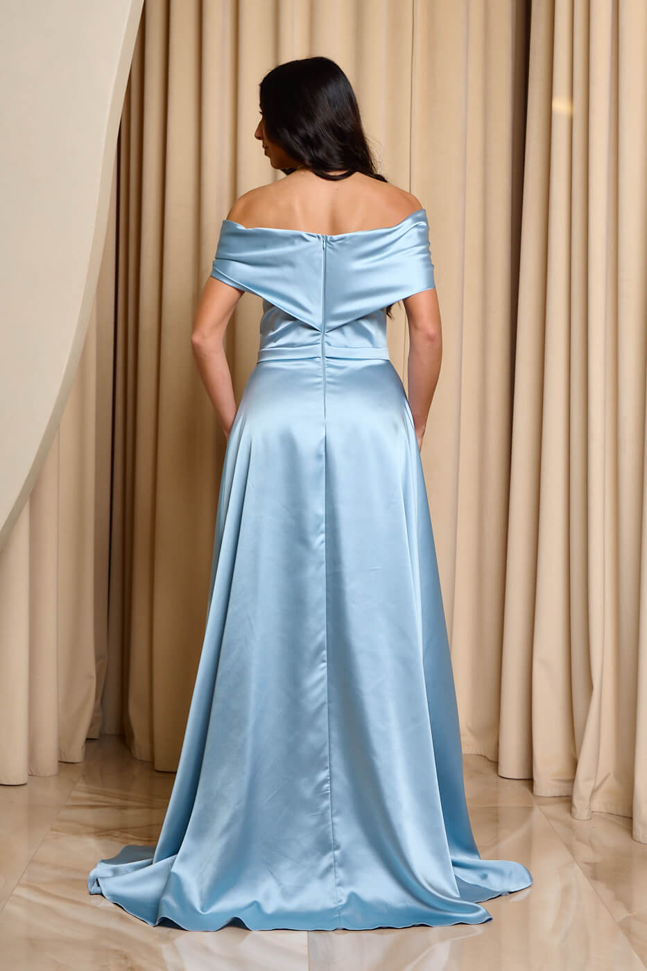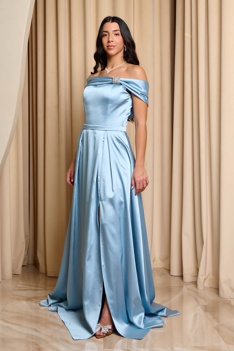 Φόρεμα maxi σατέν off shoulder με λεπτομέρεια κόσμημα baby blue . Ένα εντυπωσιακό και κομψό σατέν φόρεμα σε baby blue απόχρωση με αριστοκρατικό σχεδιασμό. Διαθέτει off shoulder κόψιμο στο πάνω μέρος με εφέ φιόγκου και κόσμημα με στρας. Έχει εσωτερικά cups και εσάρπα στην ίδια απόχρωση. Το κάτω μέρος είναι σε άλφα γραμμή με πιέτες και κομψό σκίσιμο στο πλάι. Διαθέτει εσωτερική φόδρα και κλείνει με φερμουάρ πίσω. Το ιδανικό φόρεμα για επίσημες κομψές εμφανίσεις που σίγουρα θα κλέψουν τις εντυπώσεις.