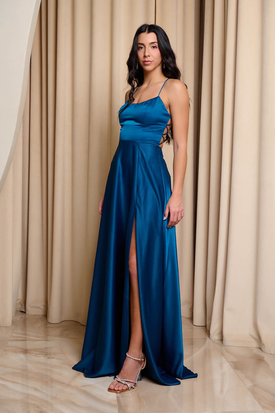 Φόρεμα maxi σατεν πετρόλ . Διαθέτει τετράγωνο μπούστο και λεπτές τιράντες που δένουν πίσω σε στυλ κορσέ και αφήνουν ανοιχτή την πλάτη. Το κάτω μέρος είναι σε ίσια αέρινη γραμμή με κομψό σκίσιμο στο πλάι.