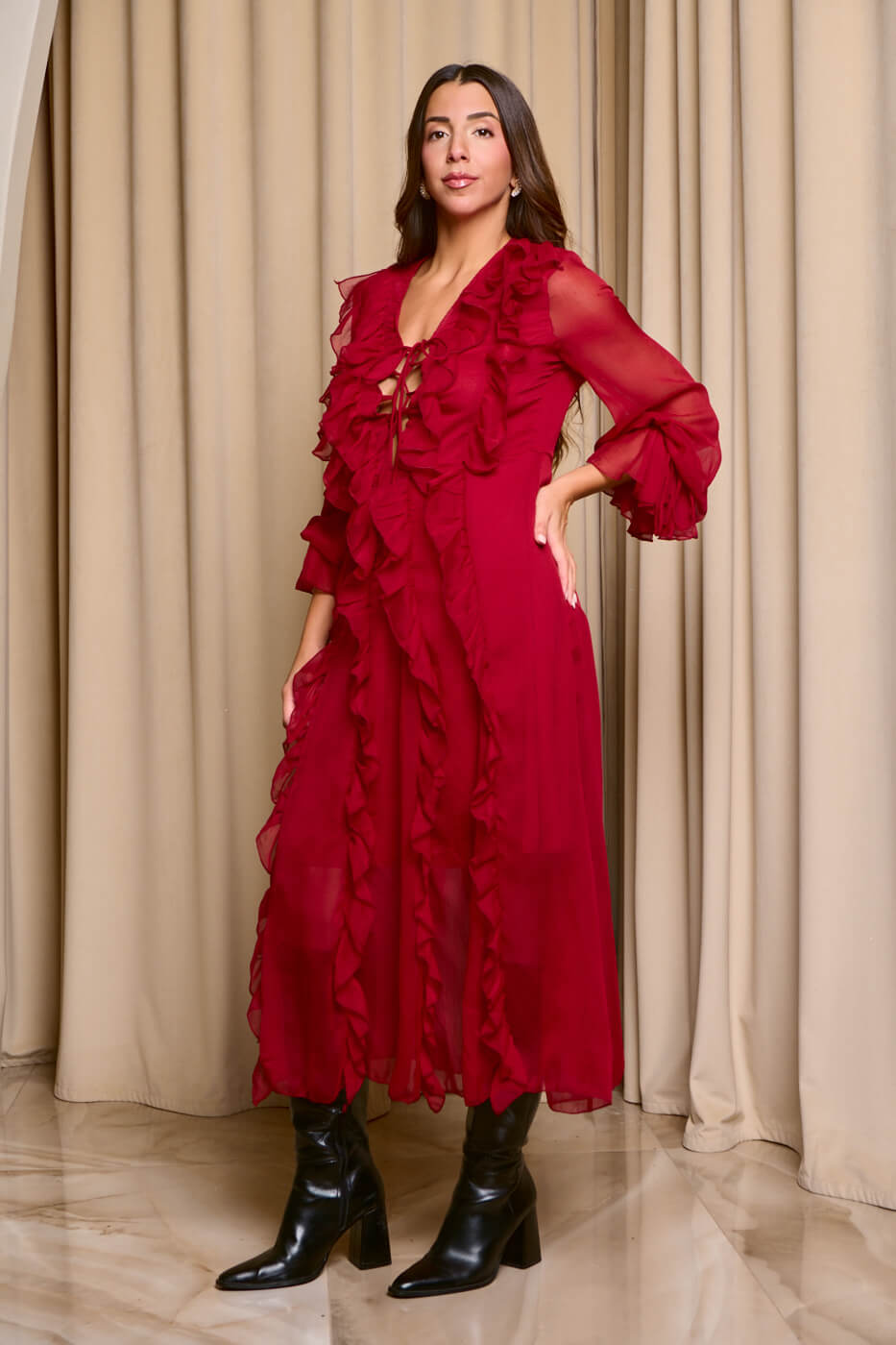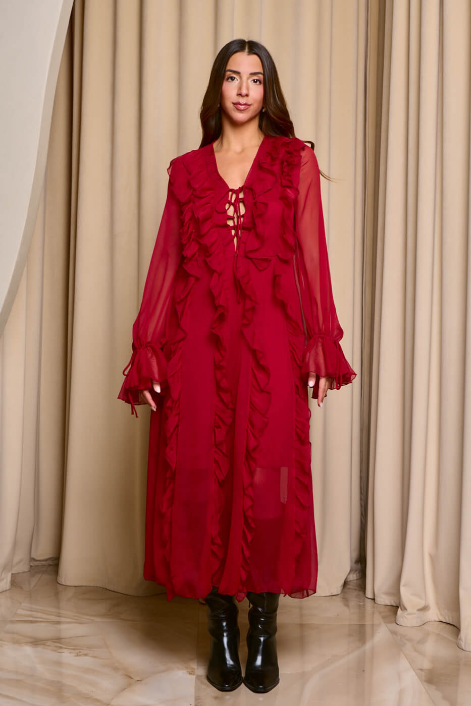 Φόρεμα maxi see through με φραμπαλά κόκκινο. Με φραμπαλά σχέδιο σε όλη την μπροστινή επιφάνεια και κορδονάκι στο μπούστο. Διαθέτει βαθύ V ντεκολτέ, μακριά μανίκια με φραμπαλά, κορδονάκι και λάστιχο στο τελείωμα και εσωτερική φόδρα.