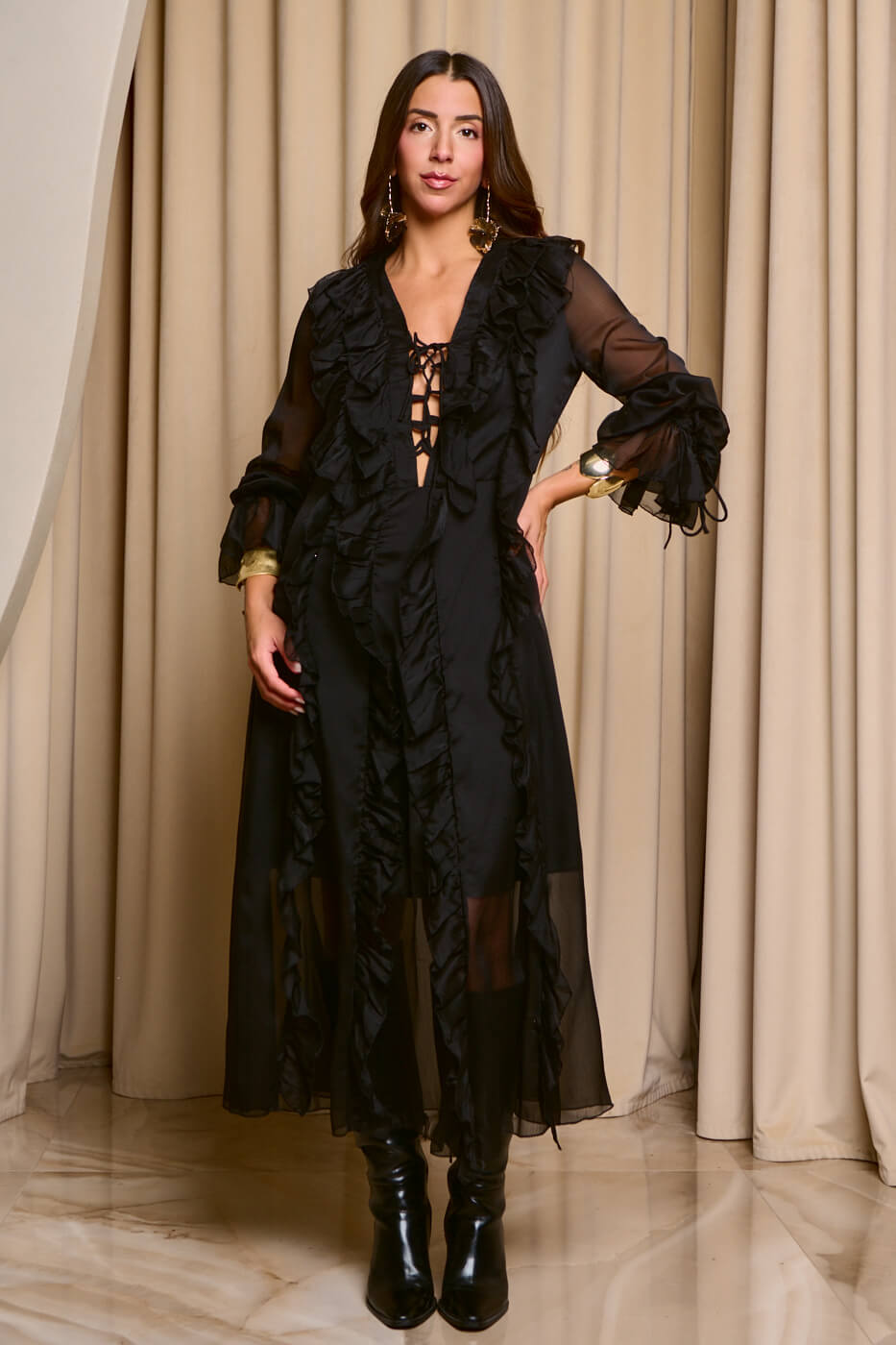 Φόρεμα maxi see through με φραμπαλά μαύρο. Με φραμπαλά σχέδιο σε όλη την μπροστινή επιφάνεια και κορδονάκι στο μπούστο. Διαθέτει βαθύ V ντεκολτέ, μακριά μανίκια με φραμπαλά, κορδονάκι και λάστιχο στο τελείωμα και εσωτερική φόδρα.