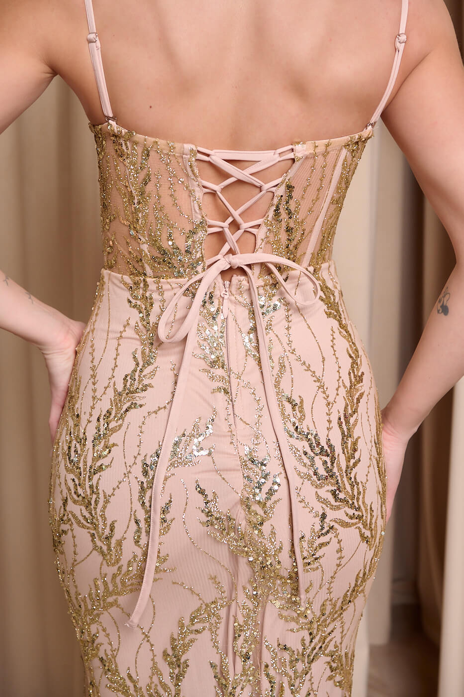 Φόρεμα maxi στράπλες γοργονέ με τρισδιάστατο γκλίτερ χρυσό. Ένα εντυπωσιακό γοργονέ φόρεμα στην πιο κομψή χρυσή απόχρωση. Διαθέτει τρισδιάστατο γκλίτερ και παγιέτες σε όλο του το μήκος. Το πάνω μέρος είναι στράπλες με μπανέλες διαφάνεια και εσωτερικά cups στο μπούστο. Το κάτω μέρος είναι σε γοργονέ γραμμή που κολακεύει τη σιλουέτα. Διαθέτει εσωτερική φόδρα και αποσπώμενες τιράντες.  Κλείνει με δέσιμο κορσέ και φερμουάρ πίσω. Ιδανικό για εντυπωσιακές επίσημες εμφανίσεις που ξεχωρίζουν για την κομψότητα και τη θηλυκή τους διάθεση.
