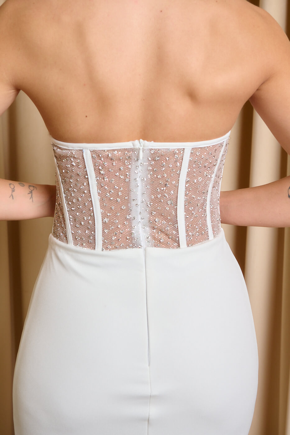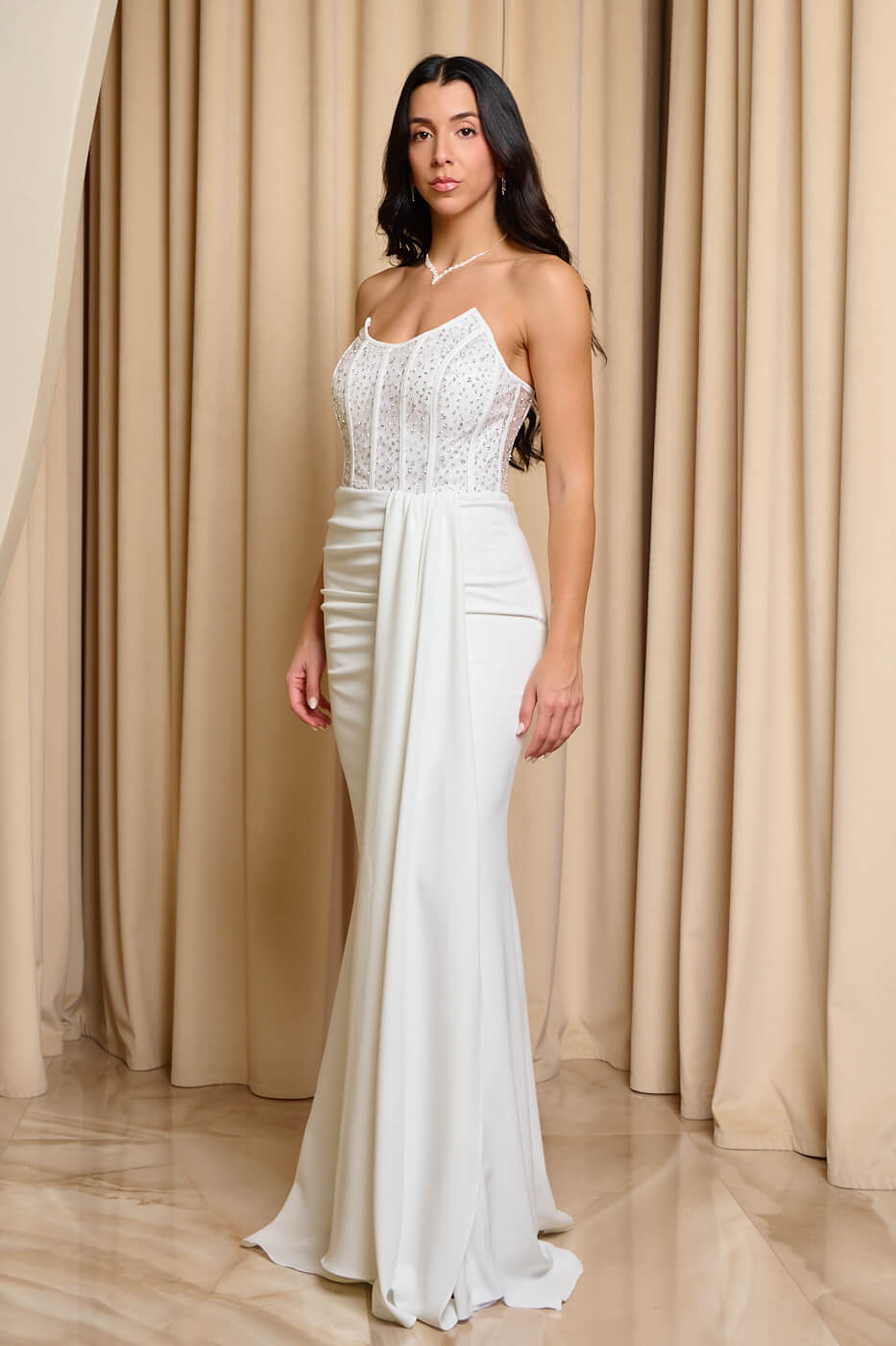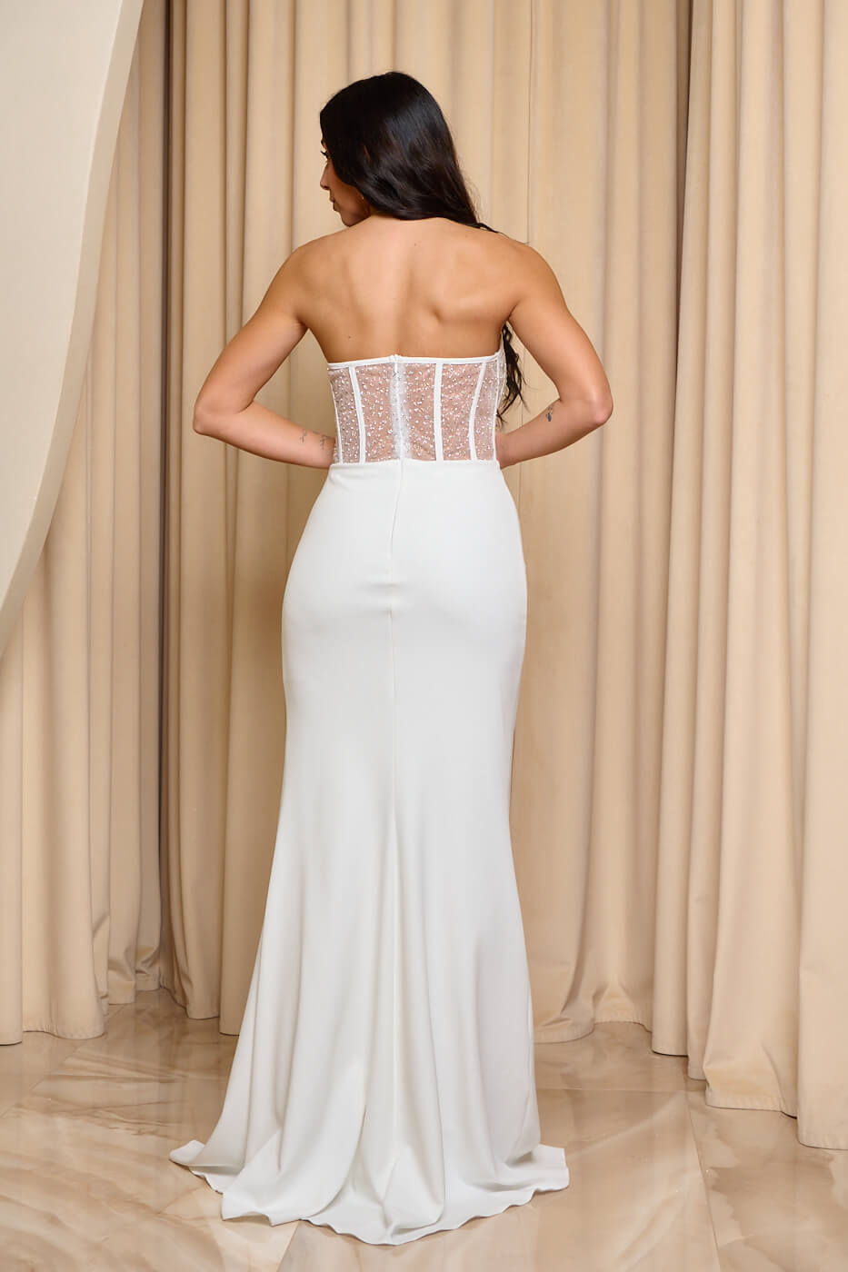 Φόρεμα maxi στράπλες με κορσέ λευκό. Διαθέτει διάφανο κορσέ με ενσωματωμένα cups στο πάνω μέρος διακοσμημένο με στρας. Επιπλέον έχει έξτρα ύφασμα ουρά στο μπροστά μέρος, κλείνει με φερμουάρ στο πίσω μέρος και εσωτερική φόδρα. Είναι σε ίσια γραμμή και έχει σκίσιμο στο πλάι.