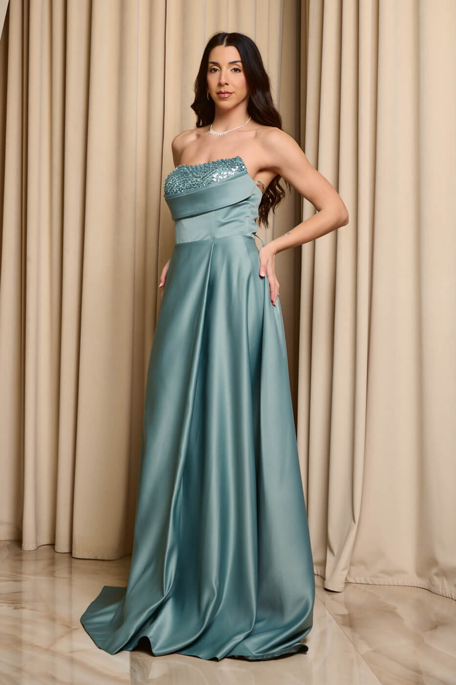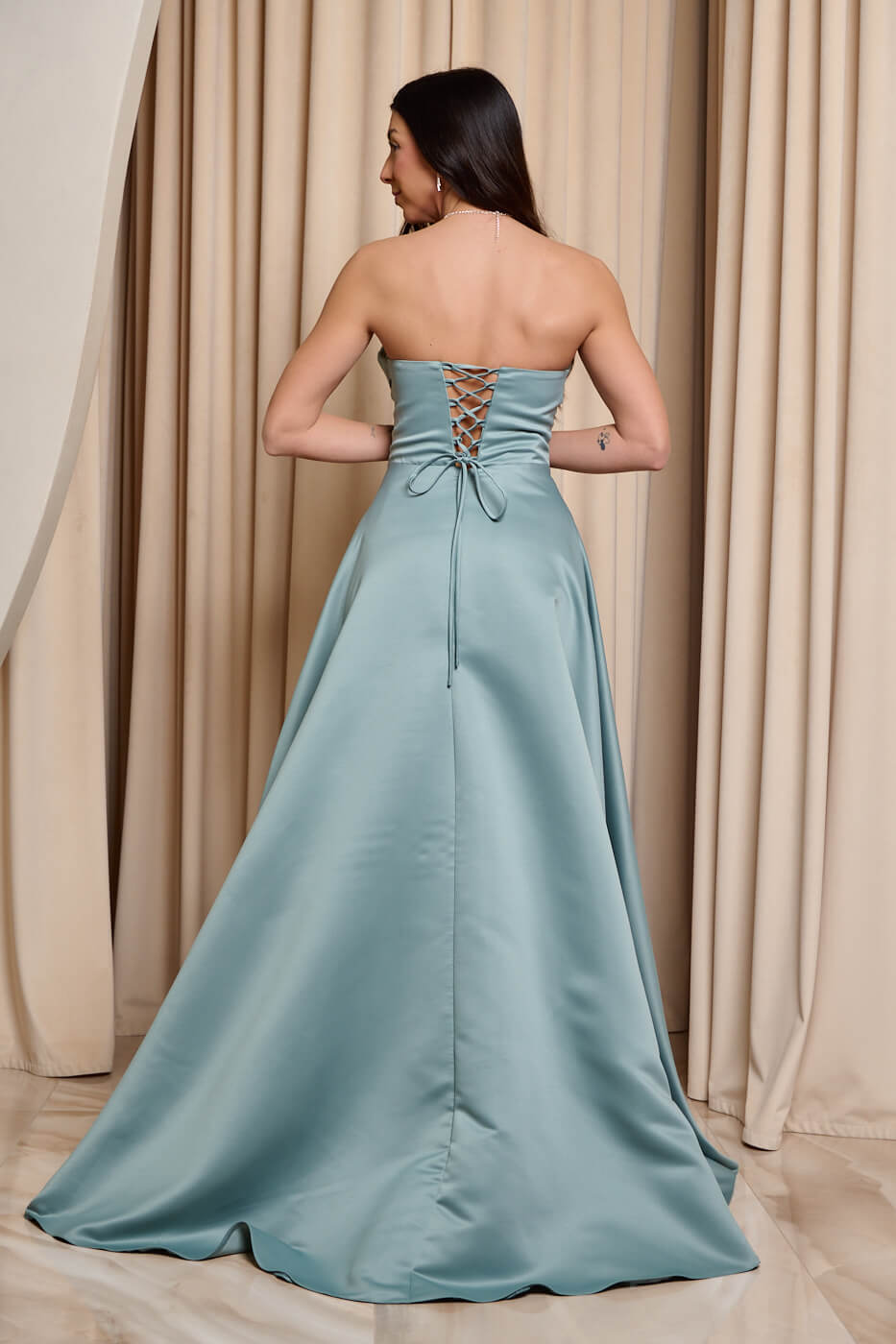 Το πάνω μέρος είναι στράπλες με λεπτομέρεια από παγιέτες στην ίδια απόχρωση και πιέτες στο μπούστο. Το κάτω μέρος είναι σε άλφα γραμμή με ωραία κίνηση και κομψό σκίσιμο στο πλάι. Διαθέτει εσωτερική φόδρα και cups στο μπούστο. Κλείνει με δέσιμο τύπου κορσέ και φερμουάρ πίσω.