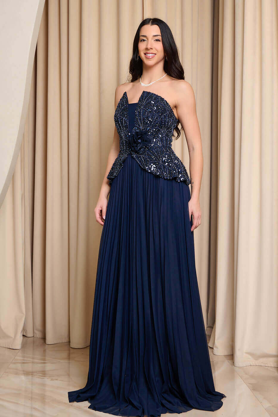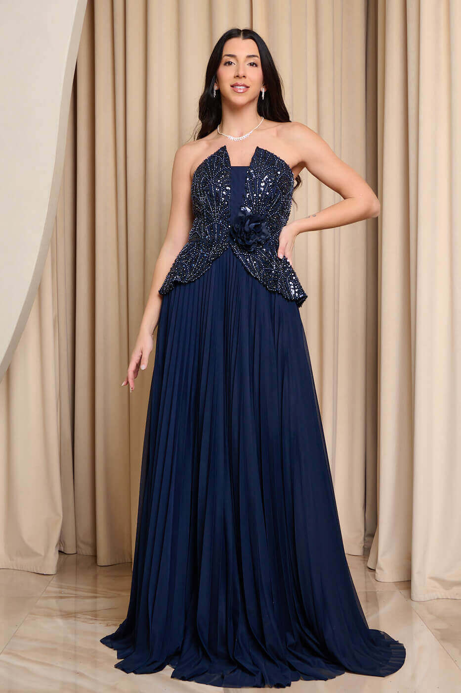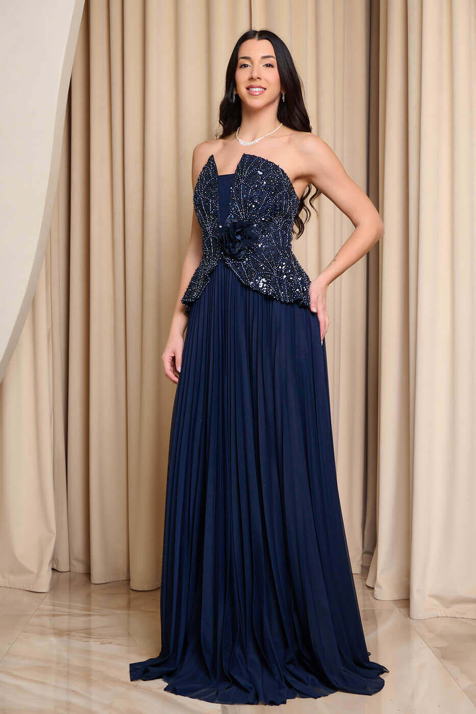 Φόρεμα maxi στράπλες πλισέ με 3D λουλούδι midnight blue. Ένα εντυπωσιακό maxi φόρεμα στην πιο κομψή midnight blue απόχρωση. Το πάνω μέρος είναι στράπλες με πέπλουμ τελείωμα διακοσμημένο με παγιέτες, χάντρες και 3D λουλούδι στην μέση. Το κάτω μέρος είναι σε άλφα γραμμή πλισέ με πολύ ωραία κίνηση. Διαθέτει εσωτερική φόδρα, cups στο στήθος και κλείνει με δέσιμο τύπου κορσέ και φερμουάρ πίσω. Ιδανικό για επίσημες λαμπερές εμφανίσεις που ξεχωρίζουν για το στυλ και την κομψότητα τους.