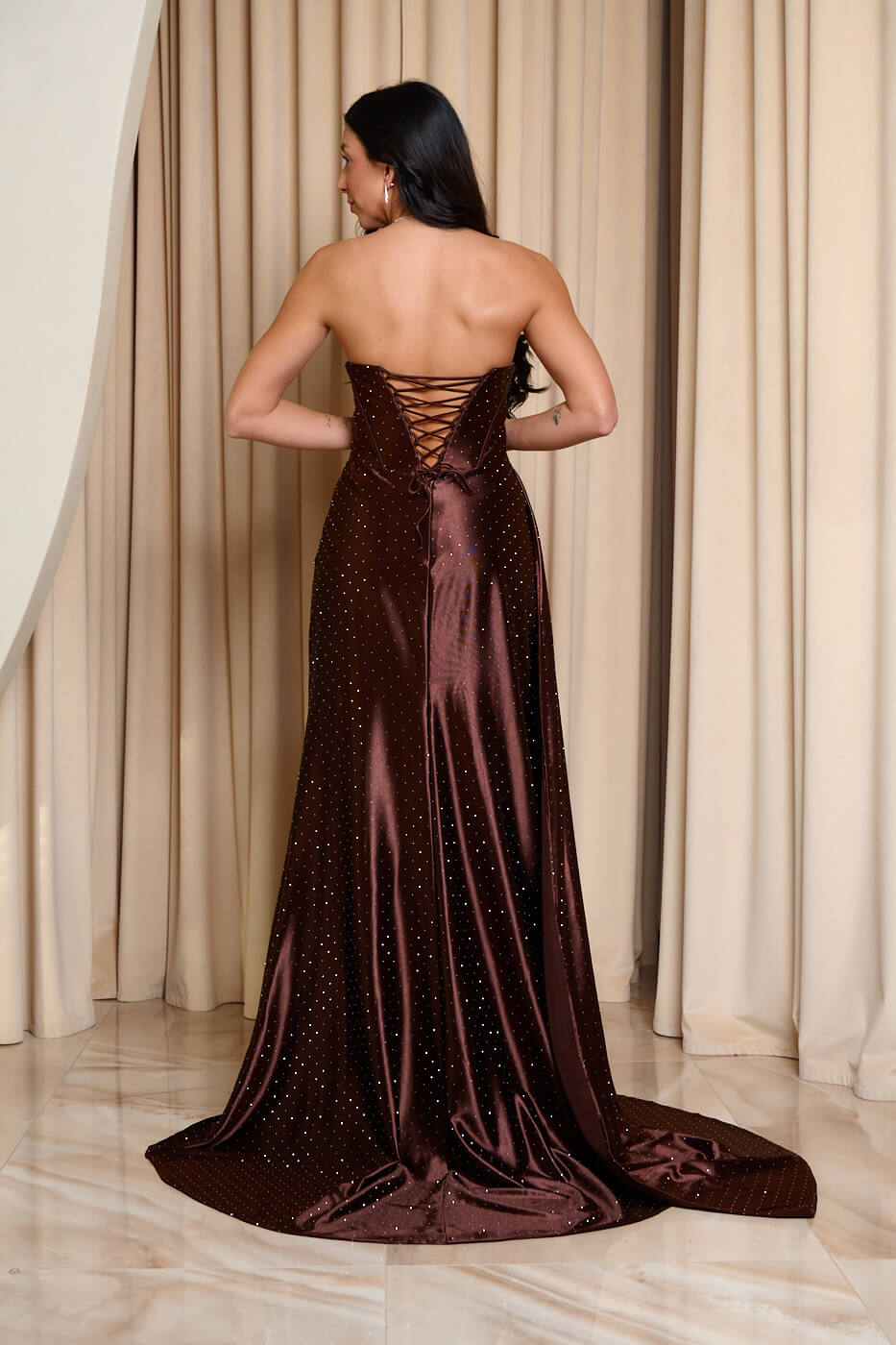 Φόρεμα maxi στράπλες σατεν με στρας καφέ. Ένα εντυπωσιακό φόρεμα σε καφέ απόχρωση. Διαθέτει μπούστο – κορσέ ,με εσωτερικά cups, διακοσμημένο με λαμπερά ασημί στρας που καταλήγει σε πολύ κολακευτικό ντραπέ σχέδιο στη μέση. Στο πλάι έχει σκίσιμο και extra ύφασμα τύπου ουρά με πιέτες. Υπάρχουν λαμπερές λεπτομέρειες στρας σε όλο το μήκος του φορέματος. Κλείνει με δέσιμο και φερμουάρ και έχει ουρά πίσω.