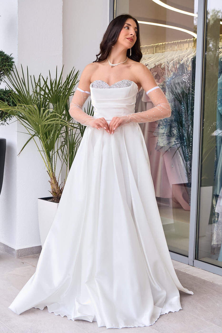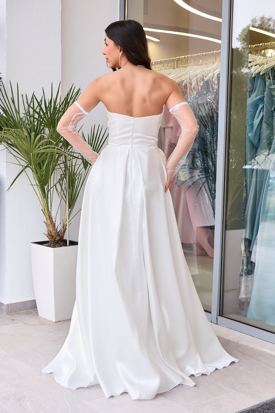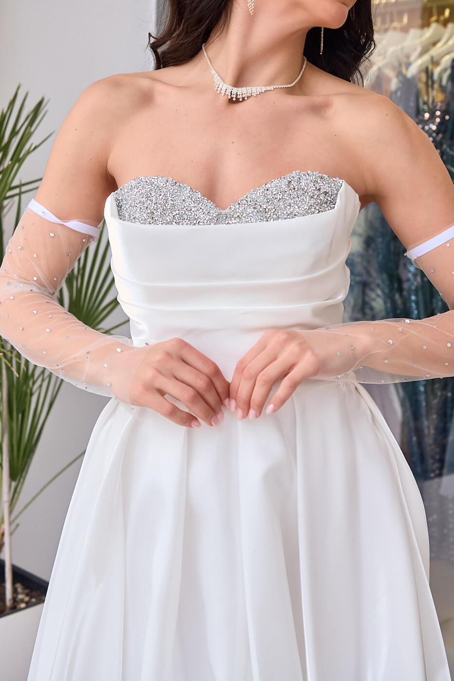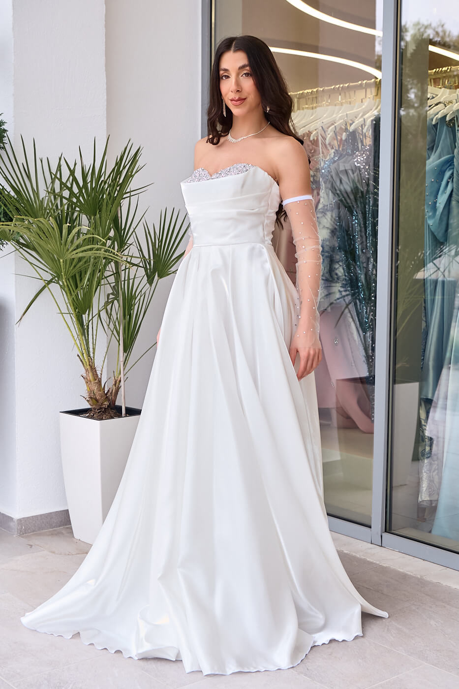 Φόρεμα Maxi Στραπλες Ταφτάς Γυαλιστερός με glitter στο μπούστο άσπρο. Με ντραπέ μπούστο διακοσμημένο με glitter και ενισχυμένο με cups, στη μέση συνεχίζει με πιέτες και καταλήγει σε κλος, προσφέρει άνεση και χάρη. Κατασκευασμένο από γυαλιστερό ταφτά με λαμπερό φινίρισμα. Έχει εσωτερική φόδρα και διαθέτει φερμουάρ στην πλάτη για εύκολη εφαρμογή. Διαθέτει ημιδιάφανα αποσπώμενα μανίκια διακοσμημένα με στρας.