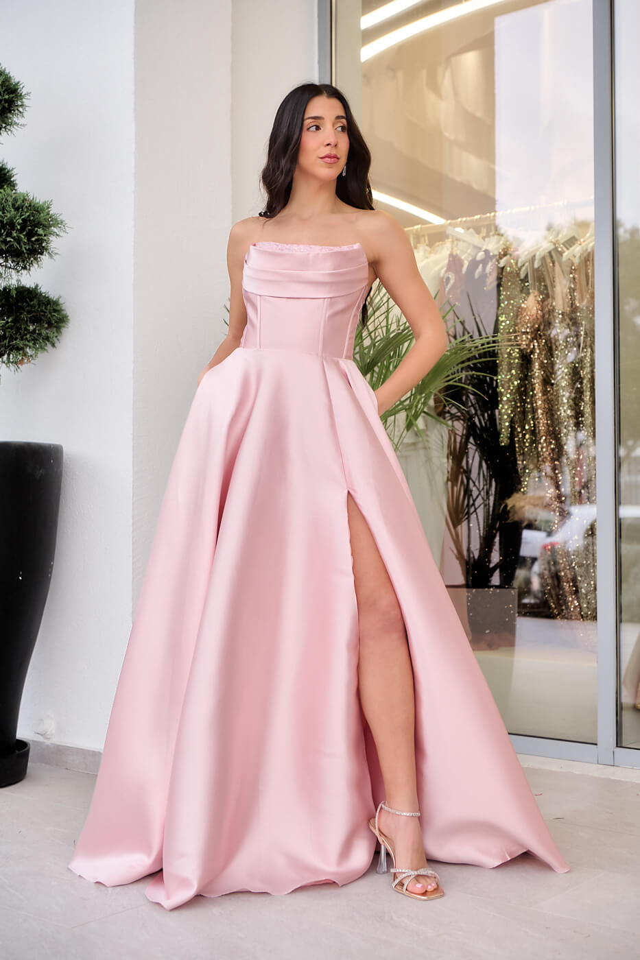 Φόρεμα maxi ταφτάς με διακοσμημένο μπούστο baby pink. Ένα κομψό φόρεμα με ρομαντική διάθεση στην πιο γλυκιά baby pink απόχρωση. Διαθέτει πιέτες και μπανέλες στο μπούστο καθώς και εσωτερική διακόσμηση από παγιέτες και χάντρες πάνω σε τούλι στην ίδια απόχρωση. Το κάτω μέρος είναι σε άλφα γραμμή με πιέτες, τσέπες και διακριτικό σκίσιμο στο πλάι. Έχει εσωτερική φόδρα και κλείνει με φερμουάρ και δέσιμο κορσέ πίσω. Ιδανικό για εντυπωσιακές επίσημες εμφανίσεις που ξεχωρίζουν και τραβούν τα βλέμματα.