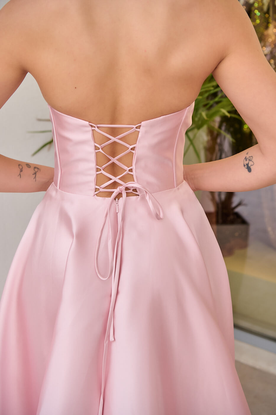 Διαθέτει πιέτες και μπανέλες στο μπούστο καθώς και εσωτερική διακόσμηση από παγιέτες και χάντρες. Το κάτω μέρος είναι σε άλφα γραμμή με πιέτες , τσέπες και διακριτικό σκίσιμο στο πλάι. Έχει εσωτερική φόδρα και κλείνει με φερμουάρ και δέσιμο κορσέ πίσω.