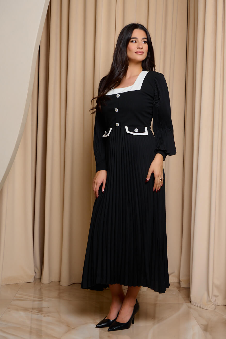 Φόρεμα maxi τύπου Chanel με πιέτες μαύρο. Διαθέτει τετράγωνη λαιμόκοψη, μακριά μανίκια με λάστιχο, μεσοφόρι, διακοσμητικά κουμπιά και τσέπες.