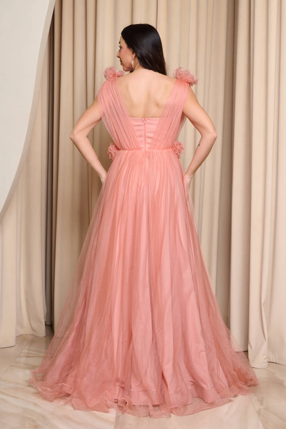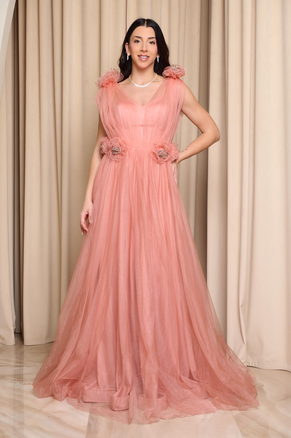 Φόρεμα maxi τούλινο με 3D λεπτομέρειες και στρας κοραλί. Εντυπωσιακό , maxi , τούλινο φόρεμα σε κοραλί απόχρωση. Στο πάνω μέρος έχει μπούστο με εσωτερικά cups το οποίο από πάνω διαθέτει τούλι. Οι ώμοι και η μέση έχουν τρισδιάστατη λεπτομέρεια με στρας που προσφέρει την απαραίτητη λάμψη στο φόρεμα. Το κάτω μέρος είναι σε άλφα γραμμή με τούλι και διπλή εσωτερική φόδρα. Κλείνει με φερμουάρ πίσω. Ιδανικό για κομψές επίσημες εμφανίσεις που ξεχωρίζουν για τη ρομαντική αισθητική τους.