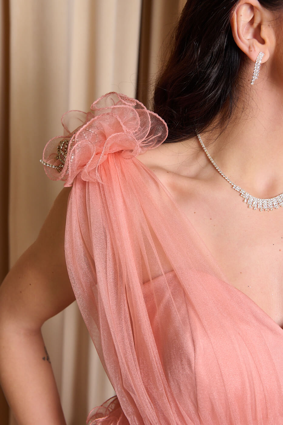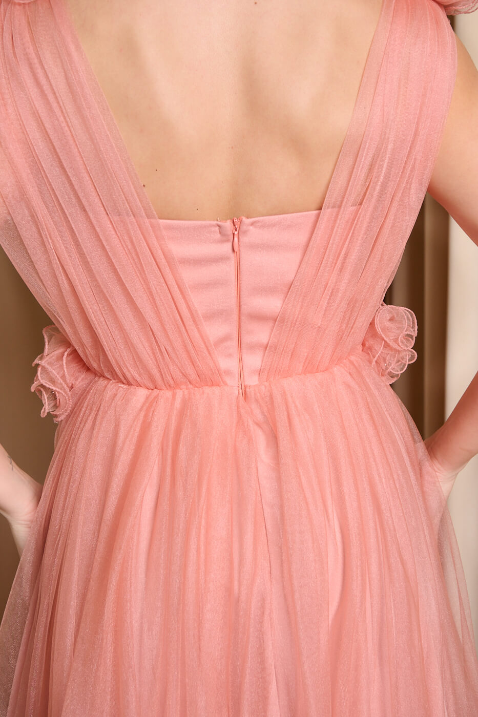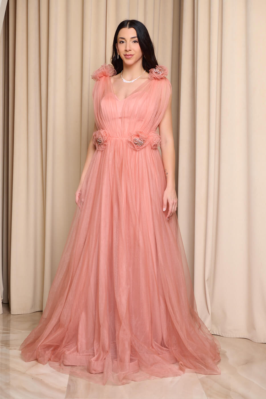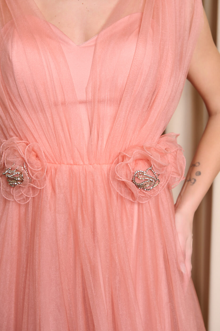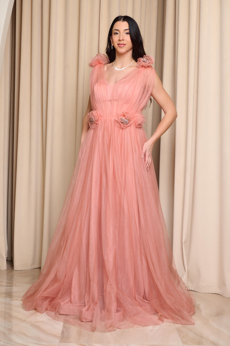 Φόρεμα maxi τούλινο με 3D λεπτομέρειες και στρας κοραλί